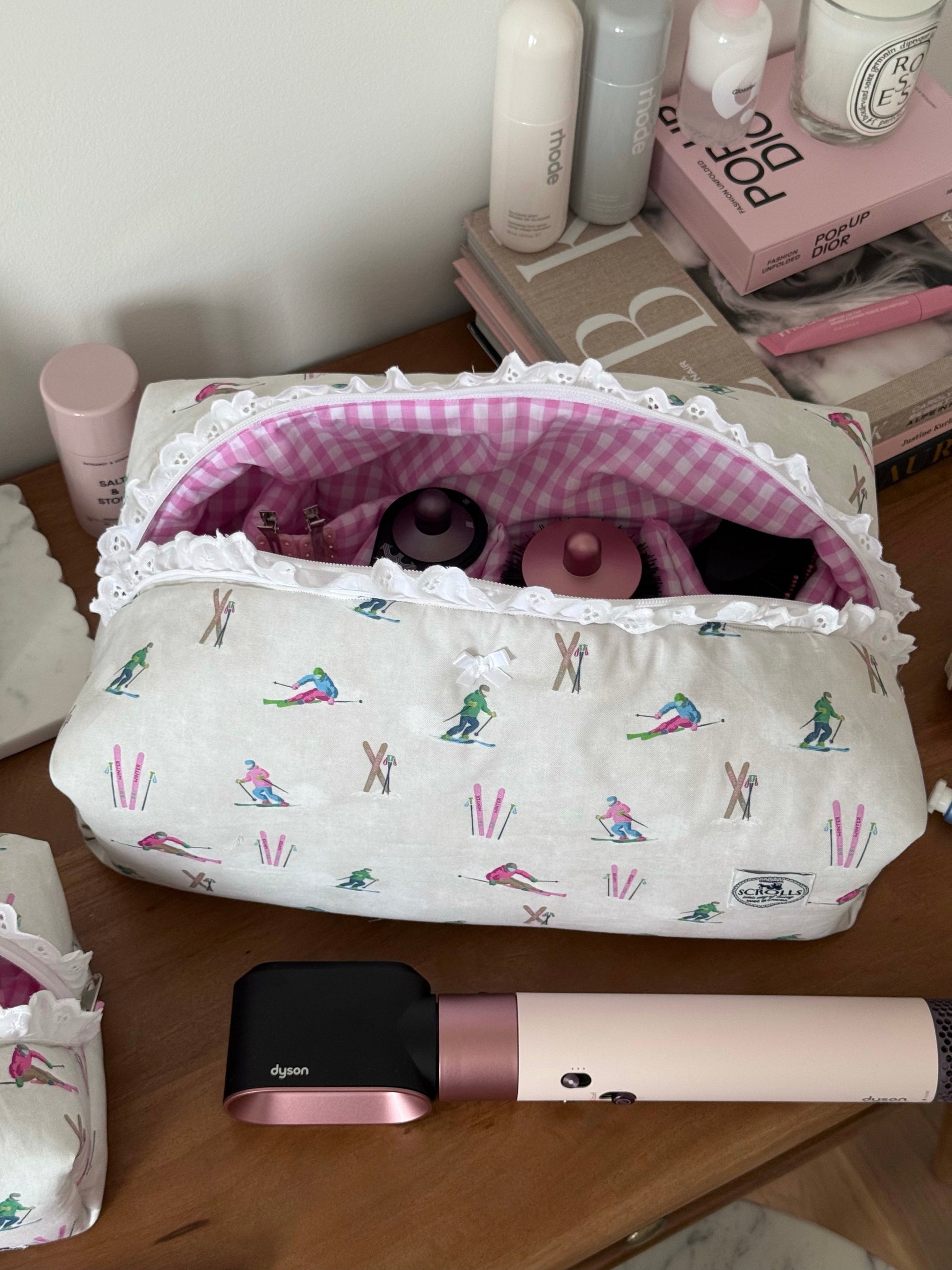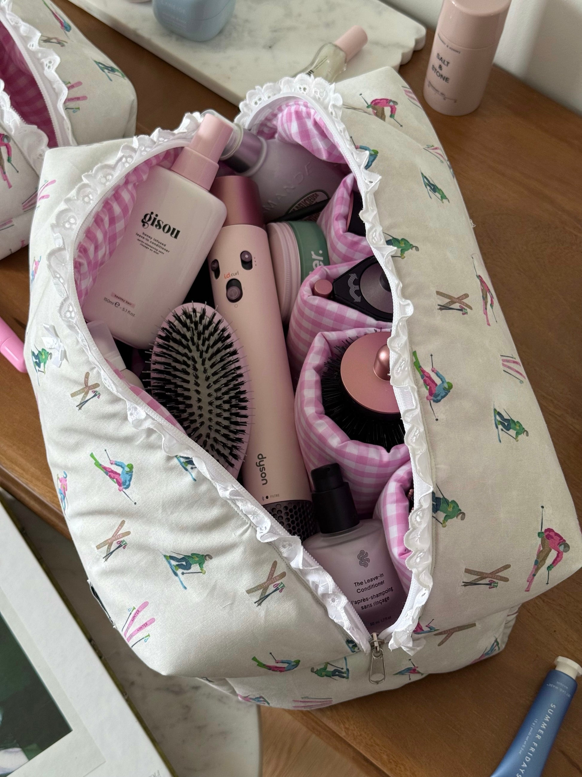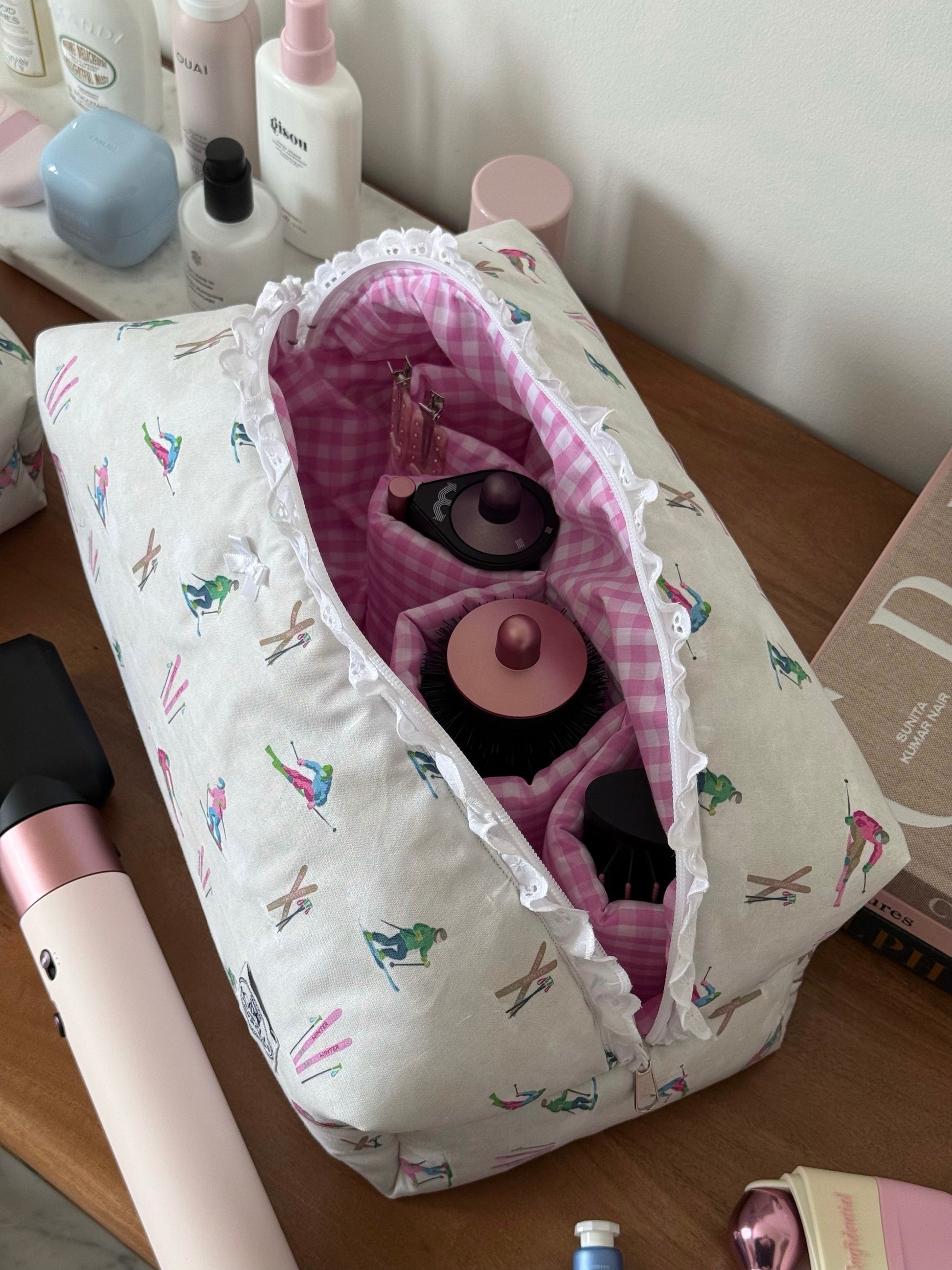 The Hair Tool pouch features 4 right pockets & 1 large pocket, with a gingham inner lining with a broderie detail.