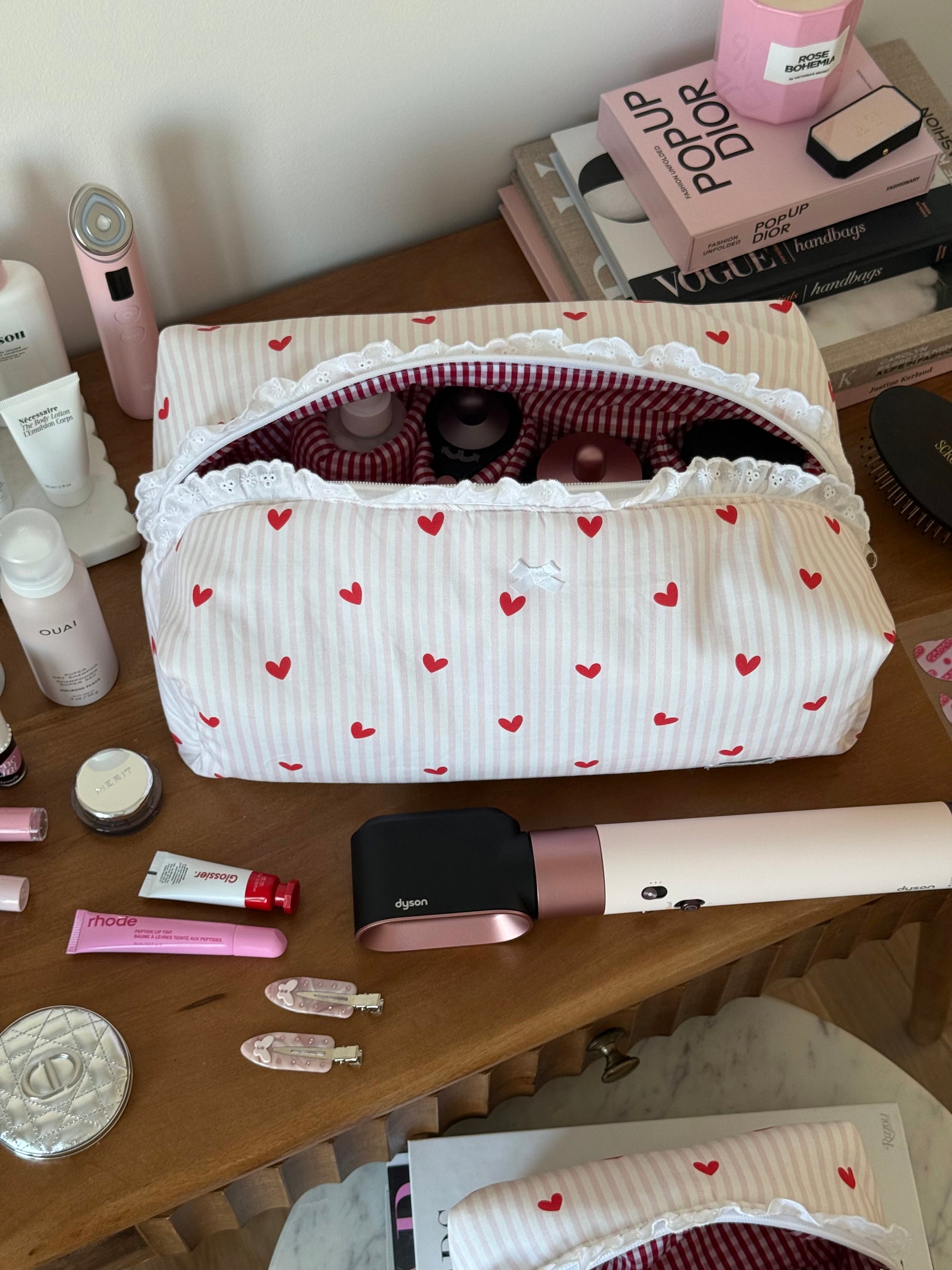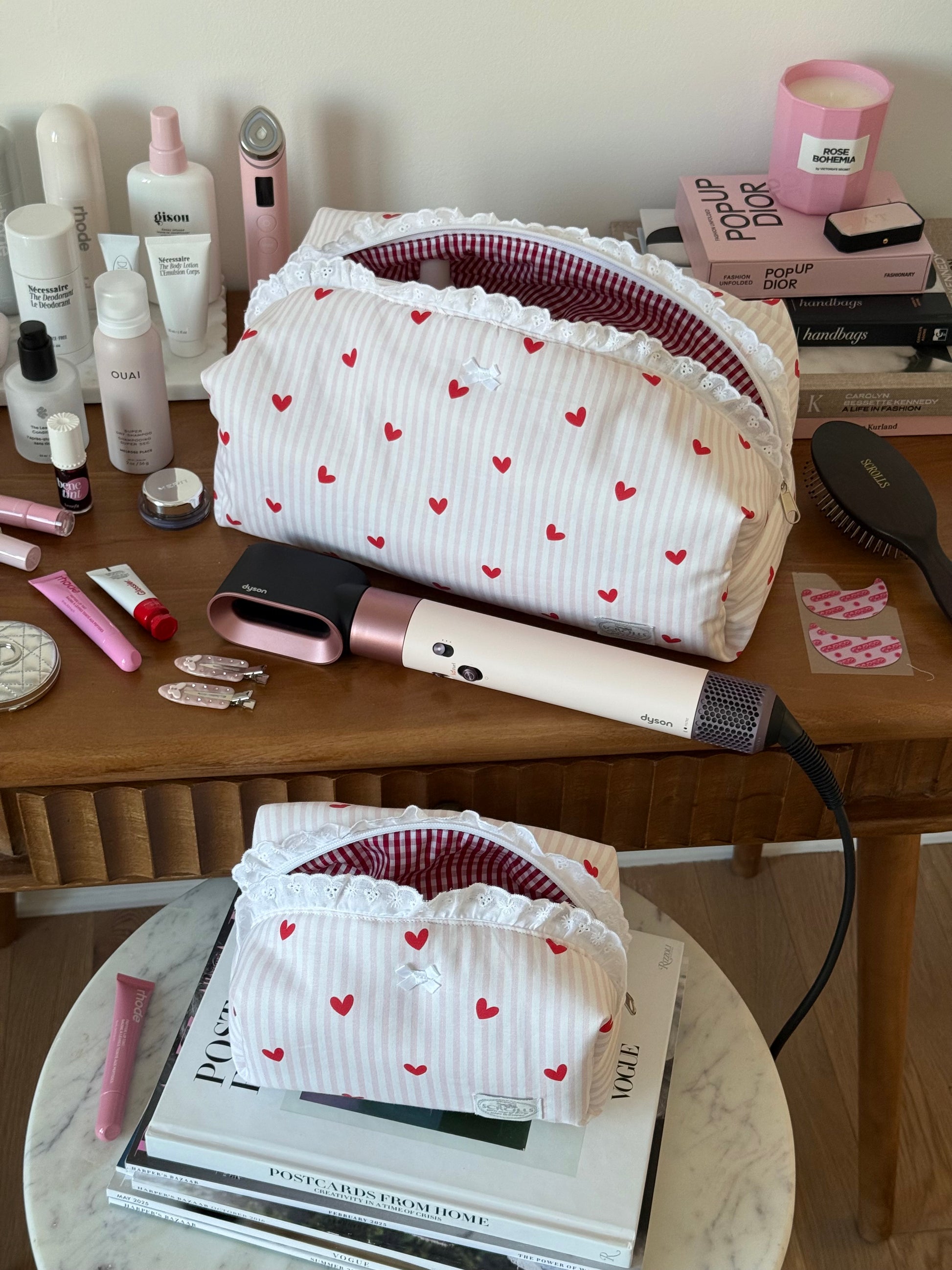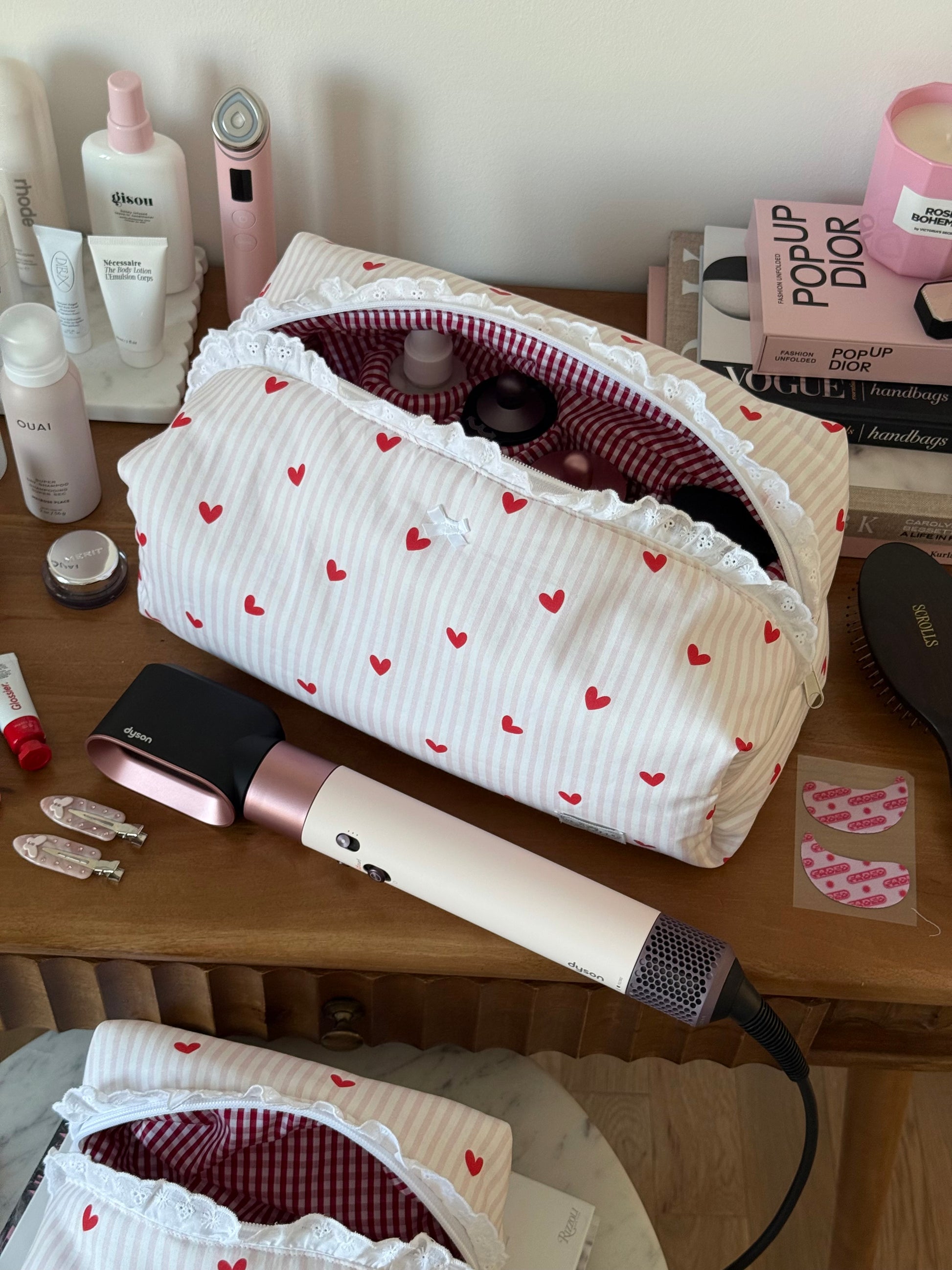 The Hair Tool pouch features 4 pockets, with a gingham inner lining with a broderie detail.