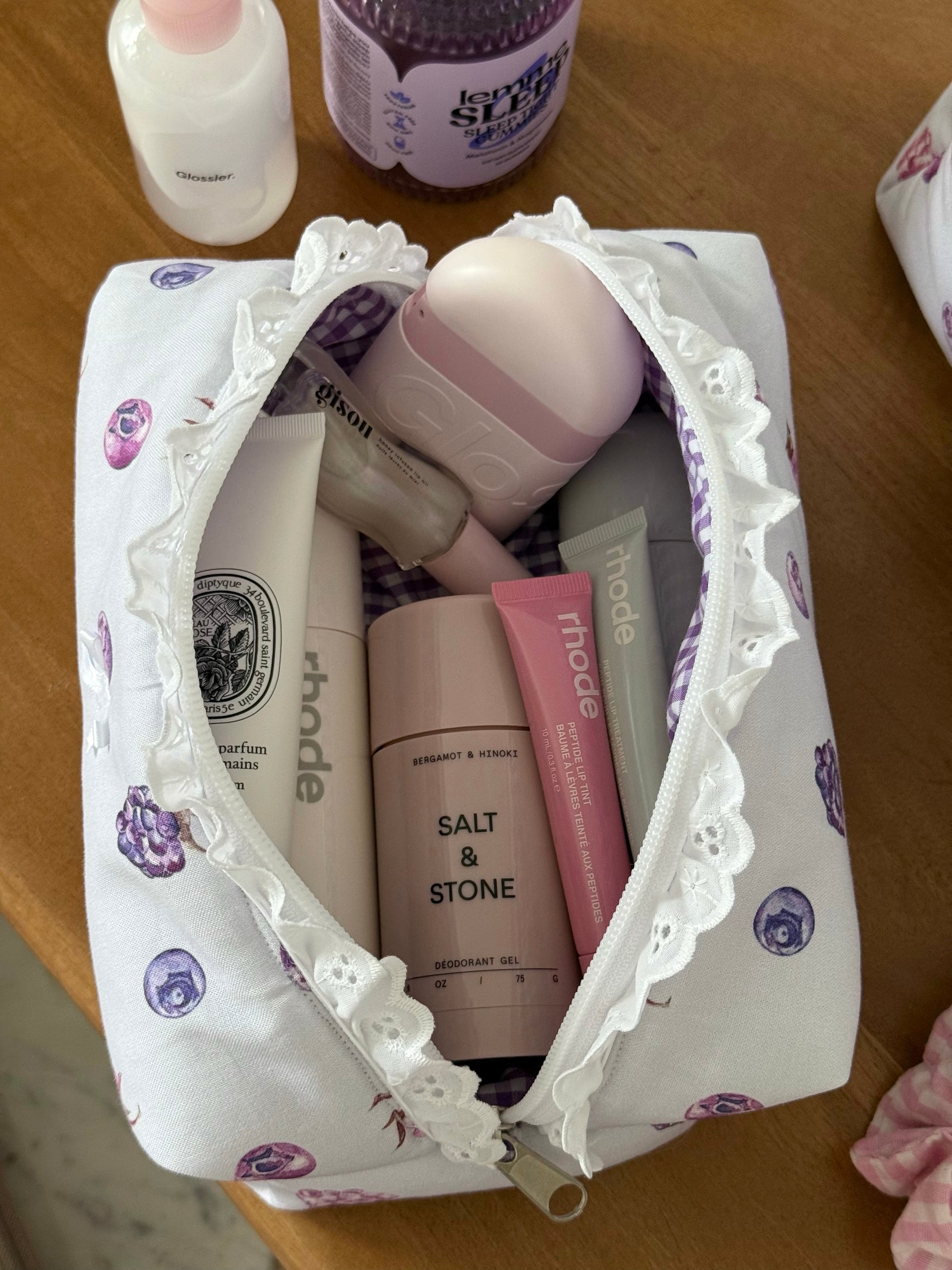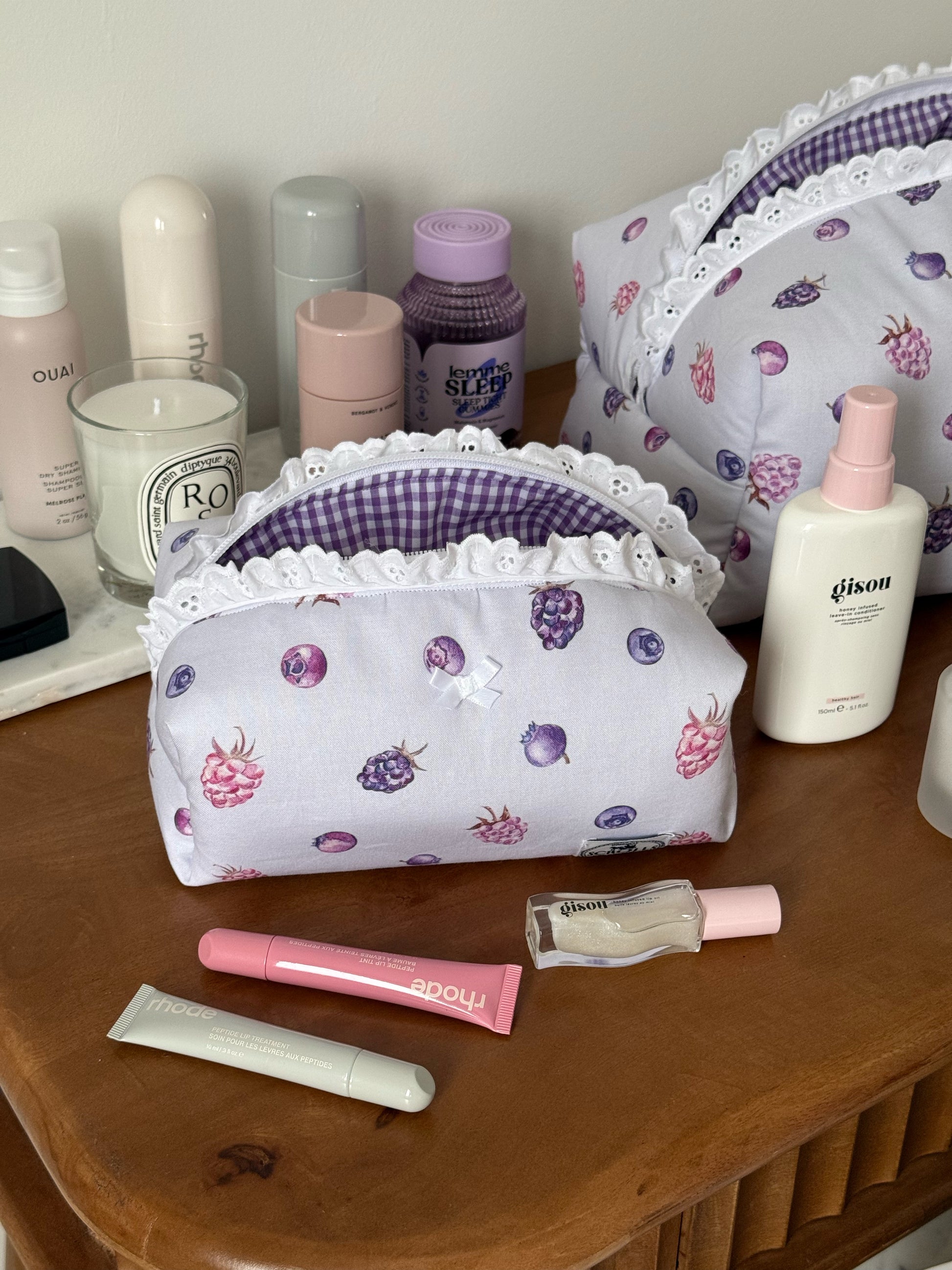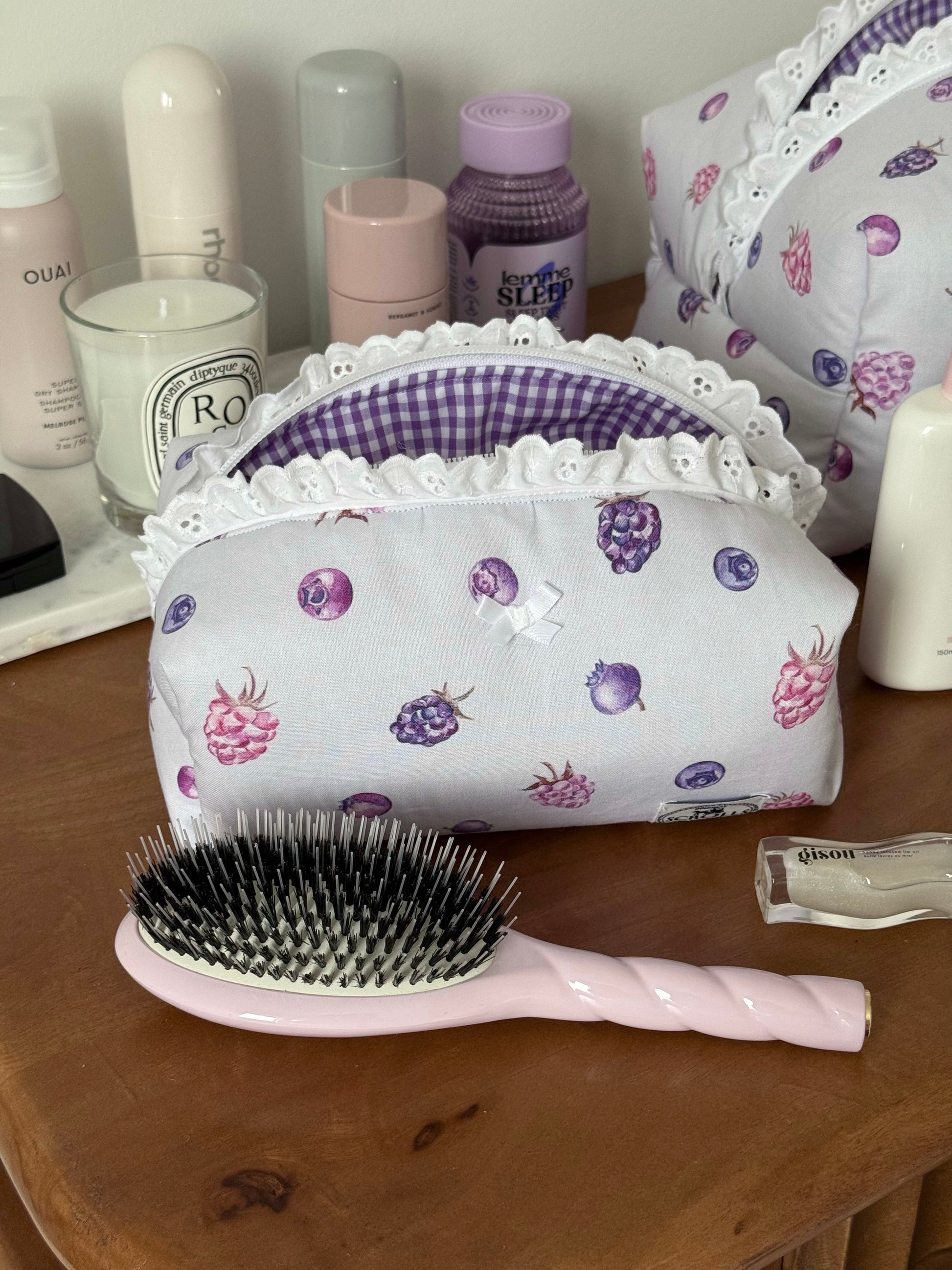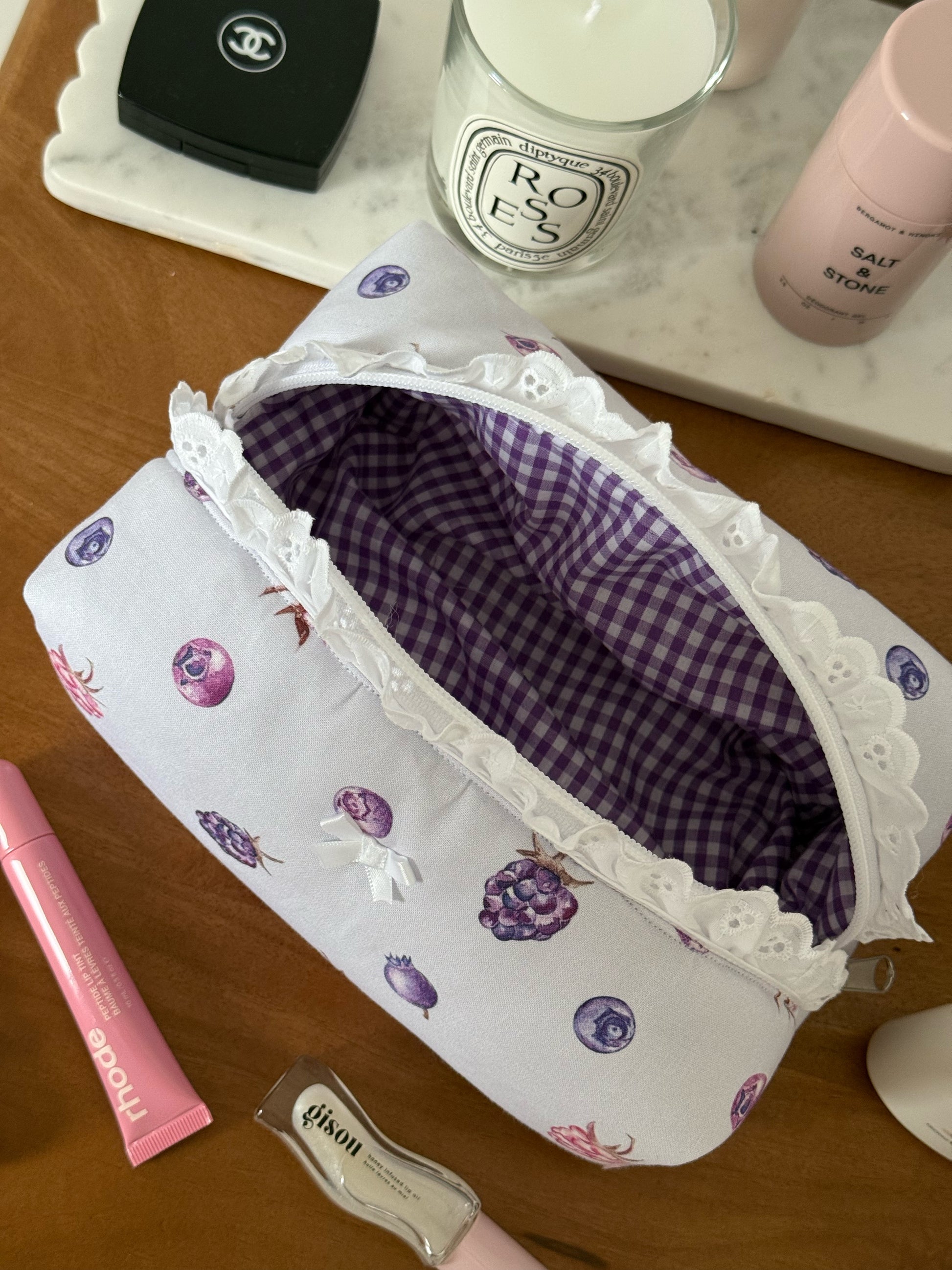 The Berry Bloom features a purple gingham inner lining & a fruity outer with a broderie detail.