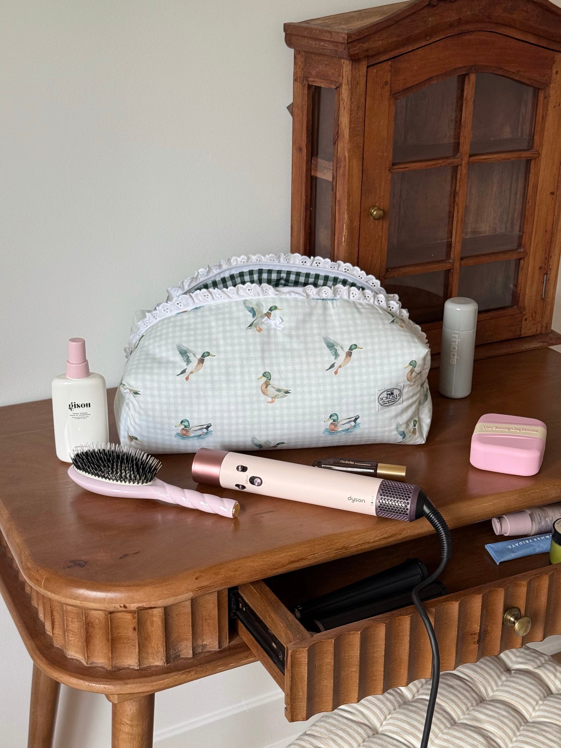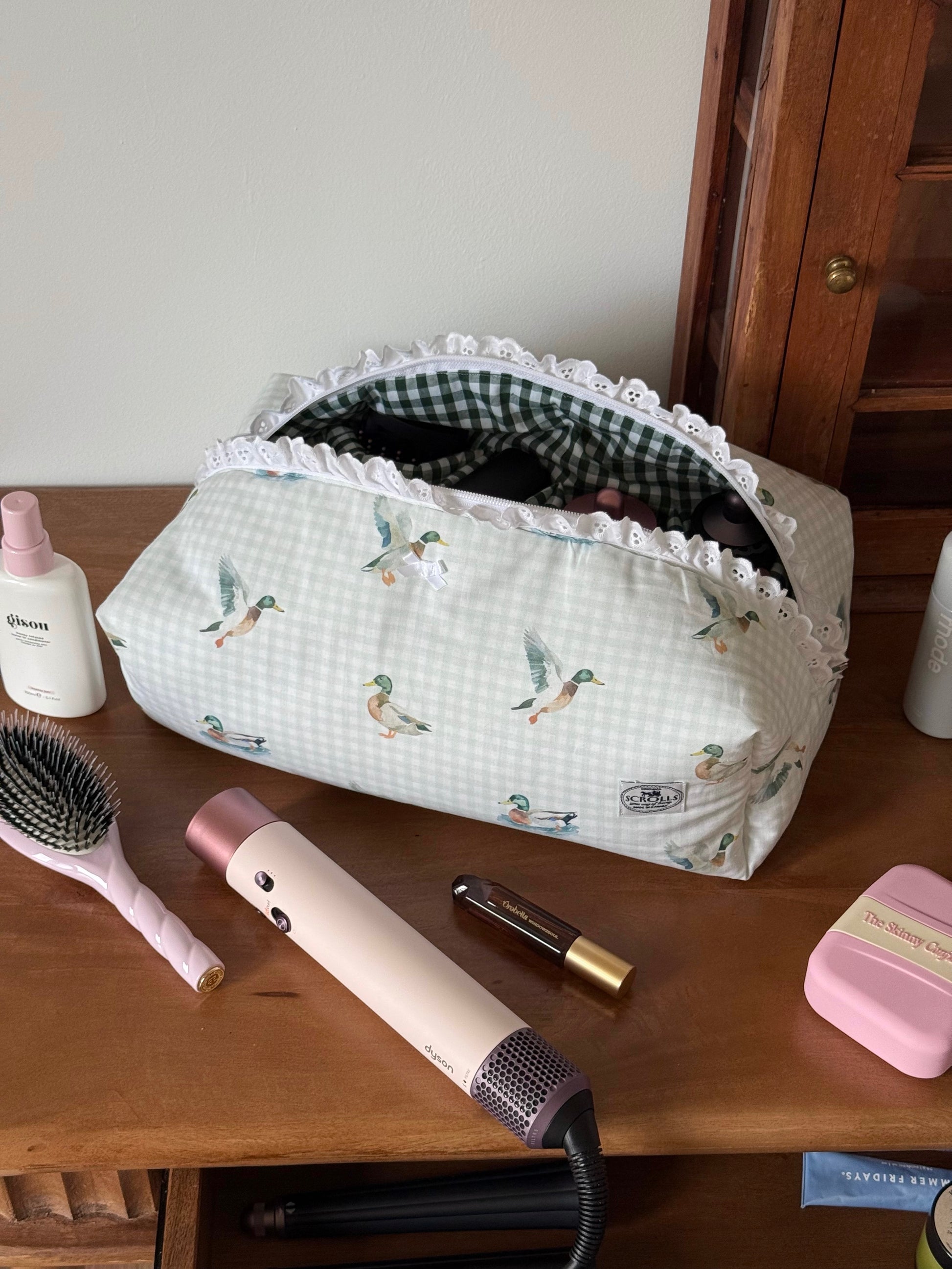 The Hair Tool pouch features 4 right pockets & 1 large pocket, with a gingham inner lining with a broderie detail.