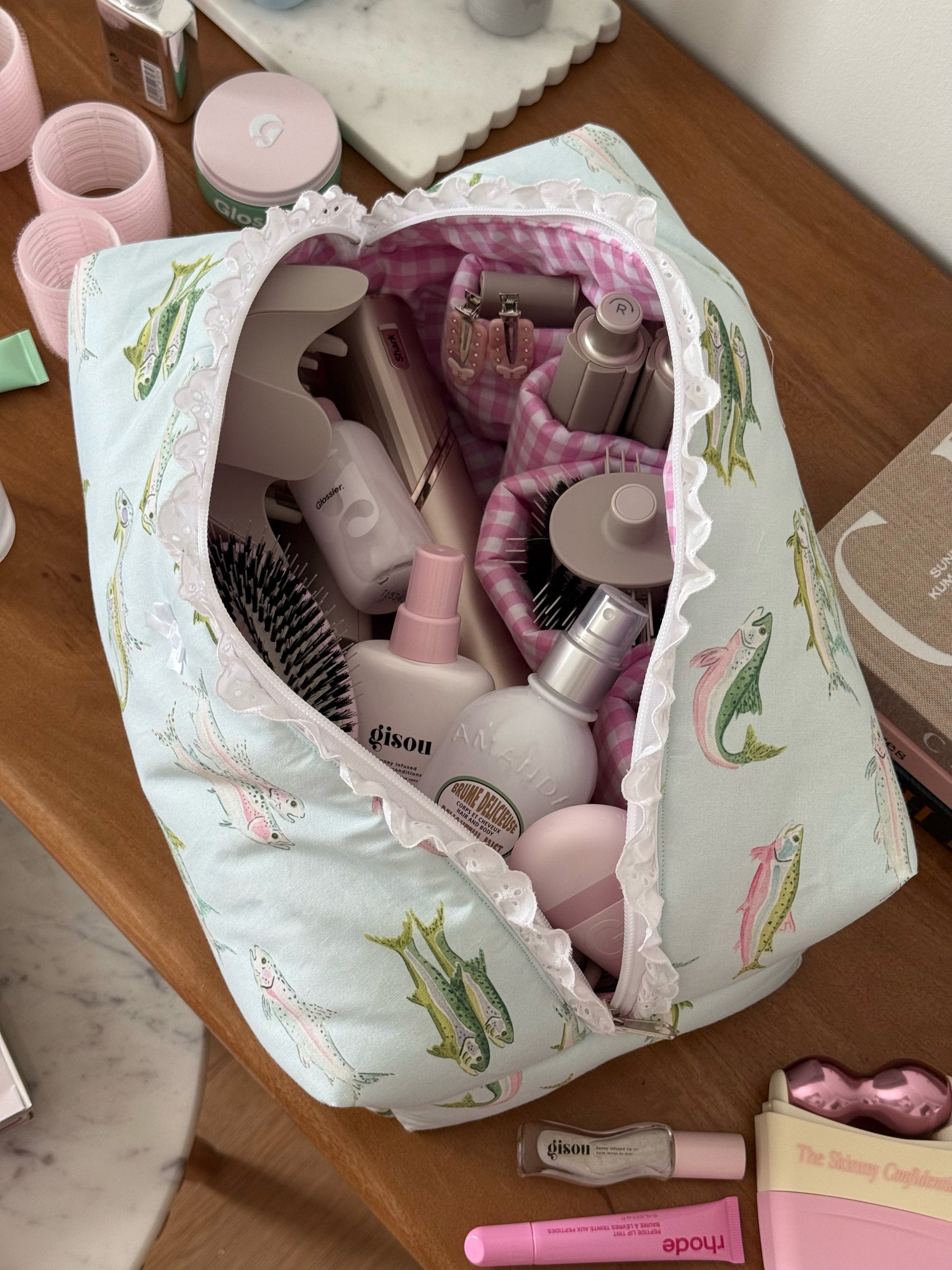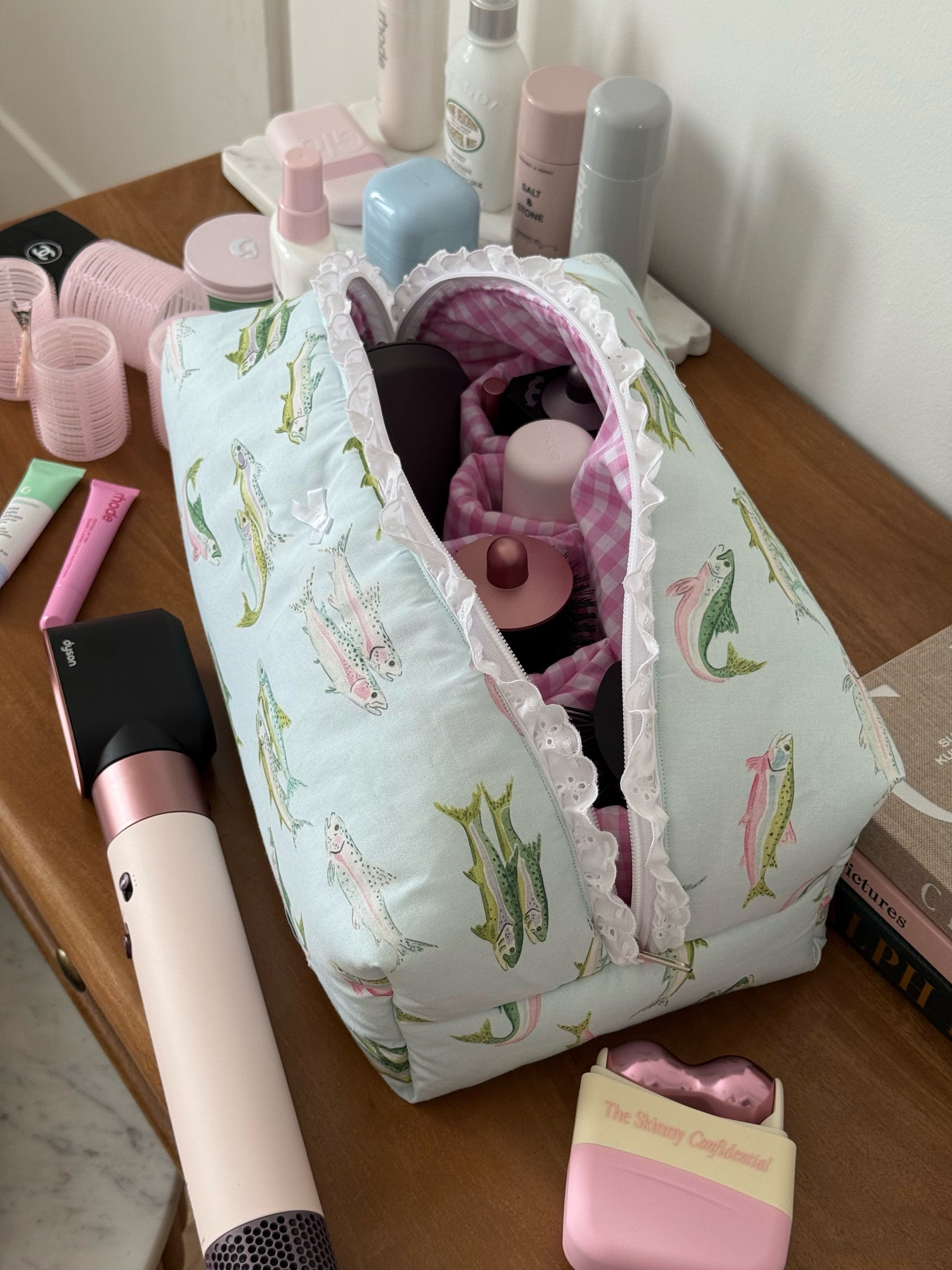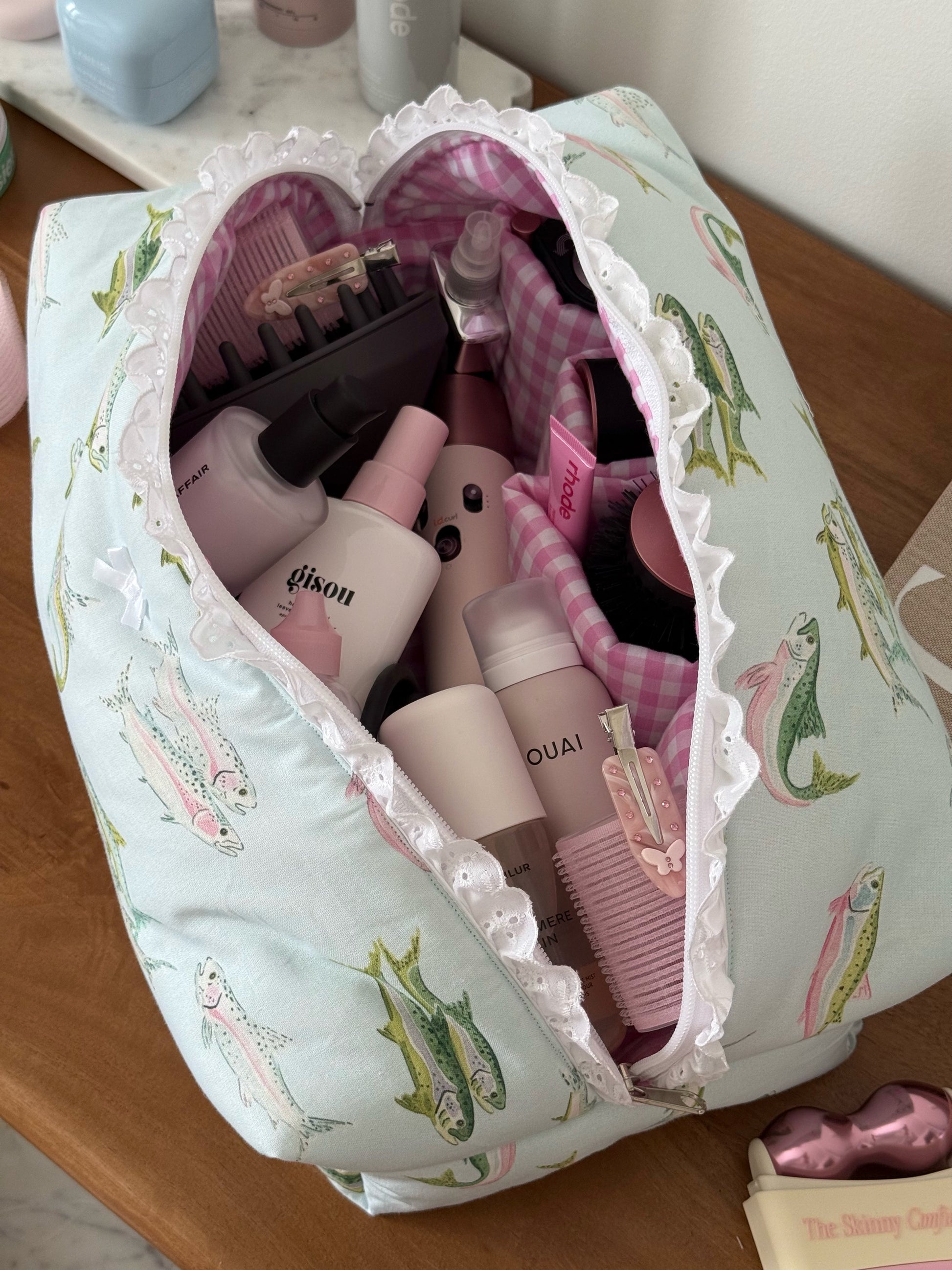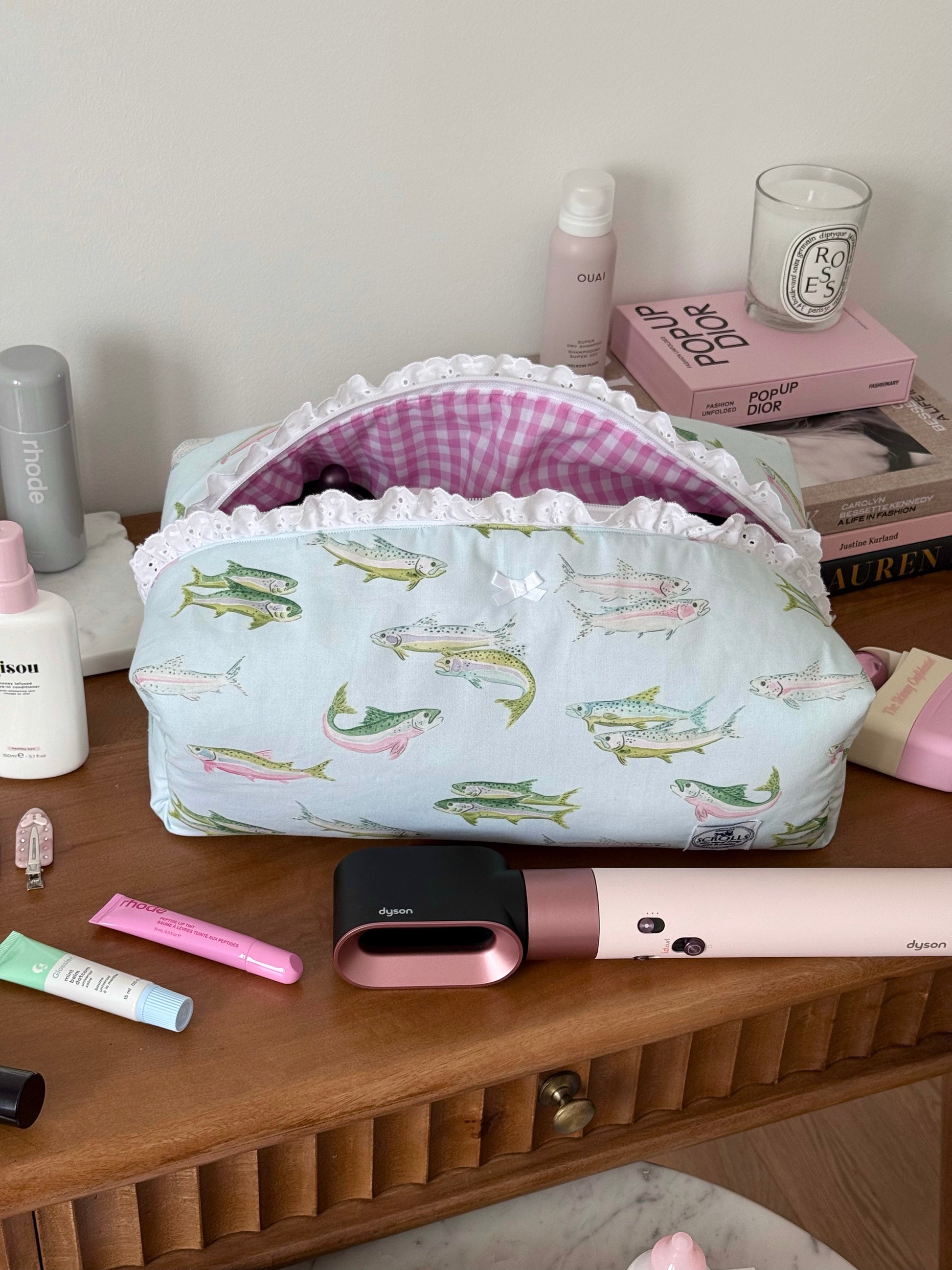 The Hair Tool pouch features 4 right pockets & 1 large pocket, with a gingham inner lining with a broderie detail.