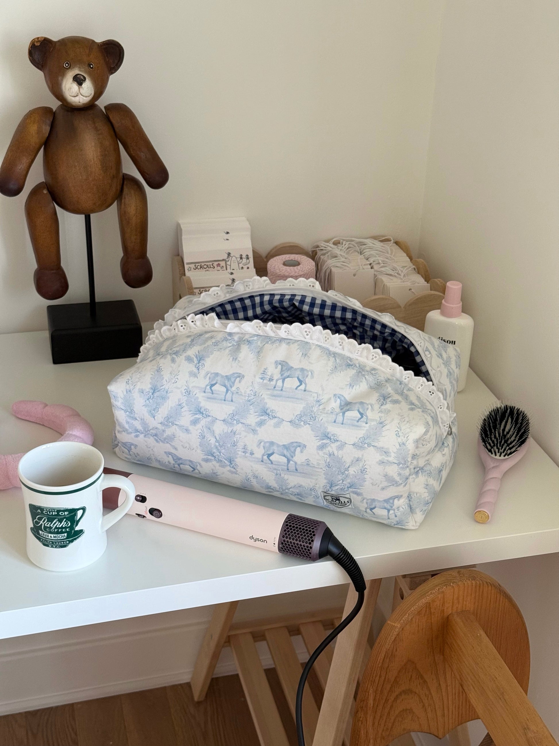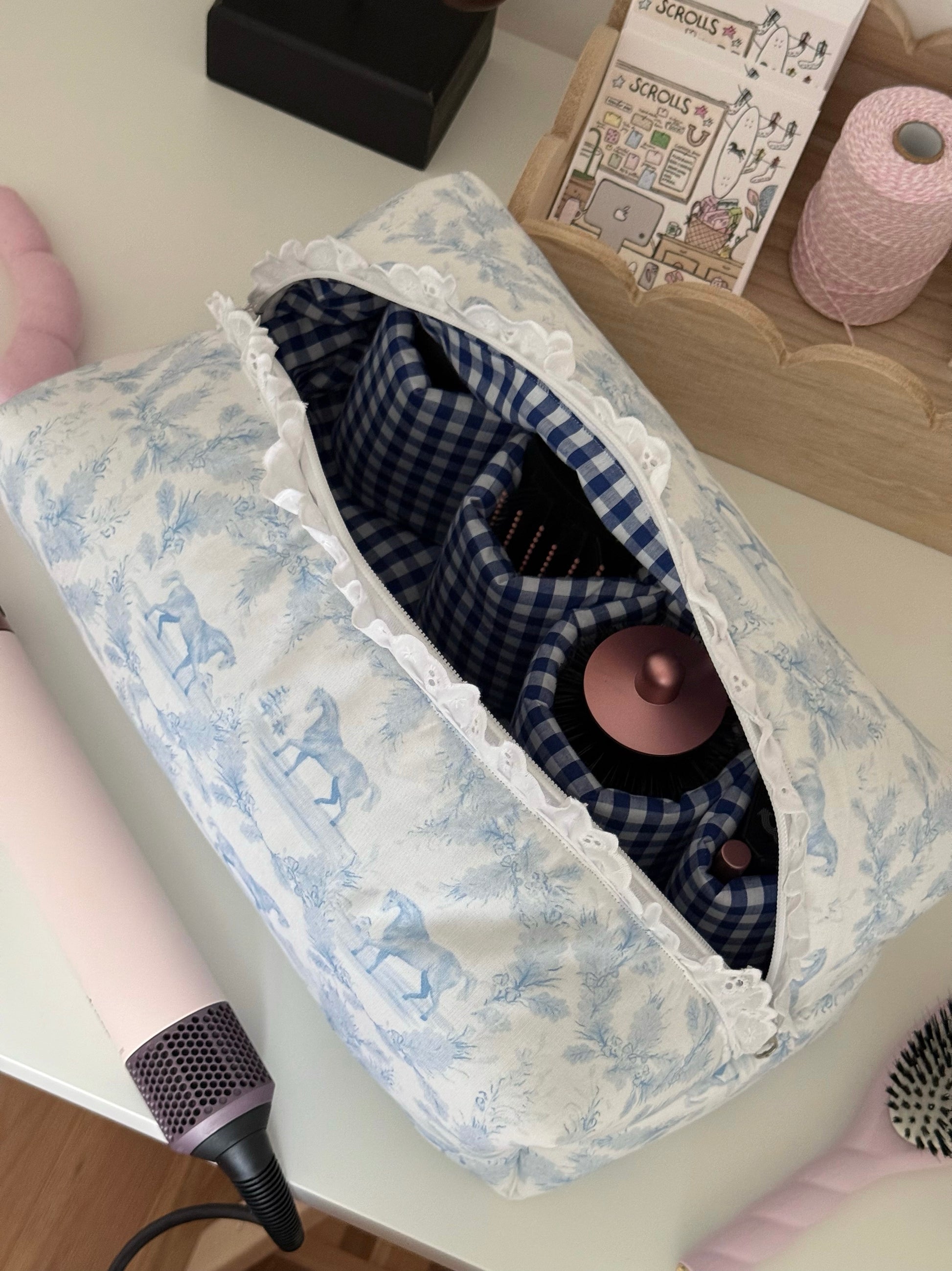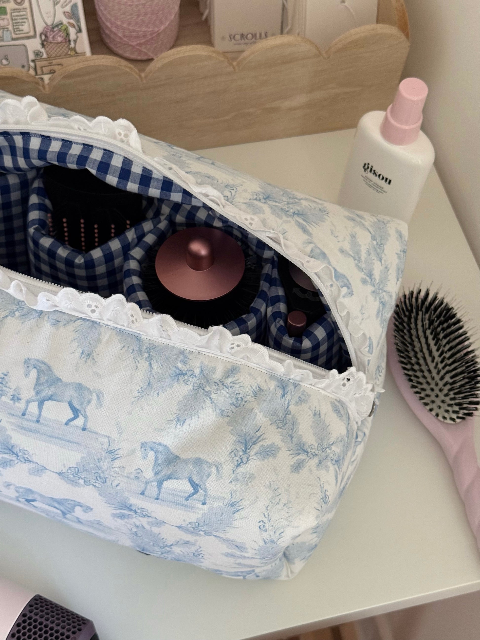 The Hair Tool pouch features 4 right pockets & 1 large pocket, with a gingham inner lining with a broderie detail.