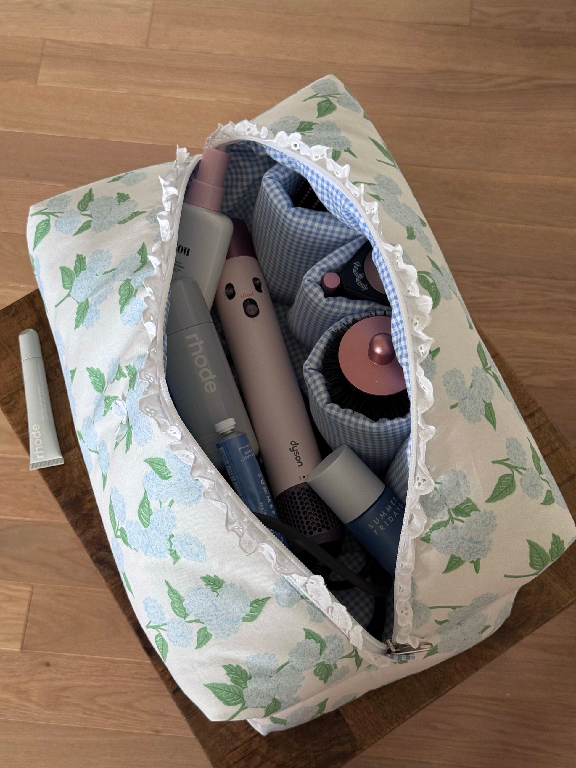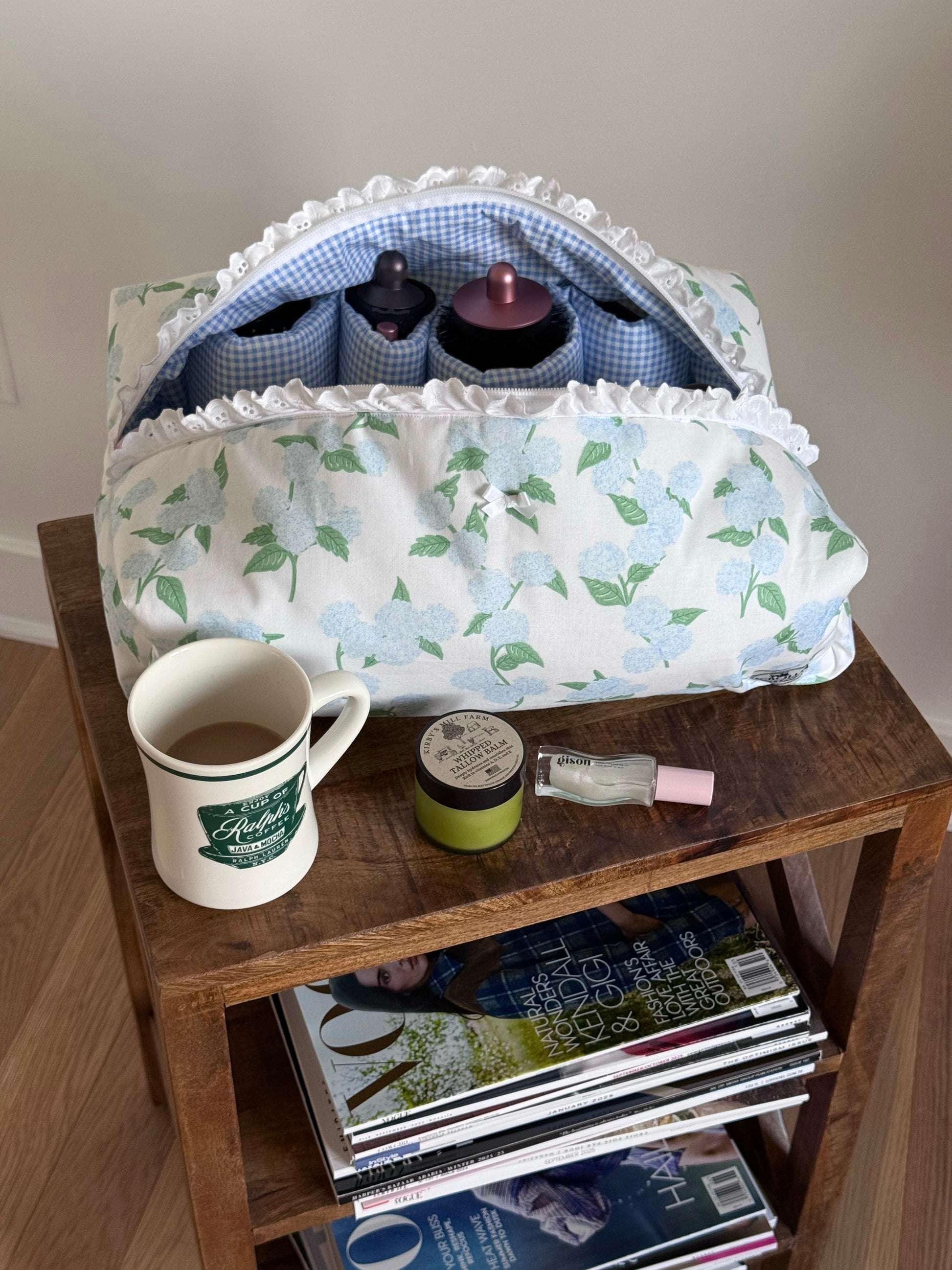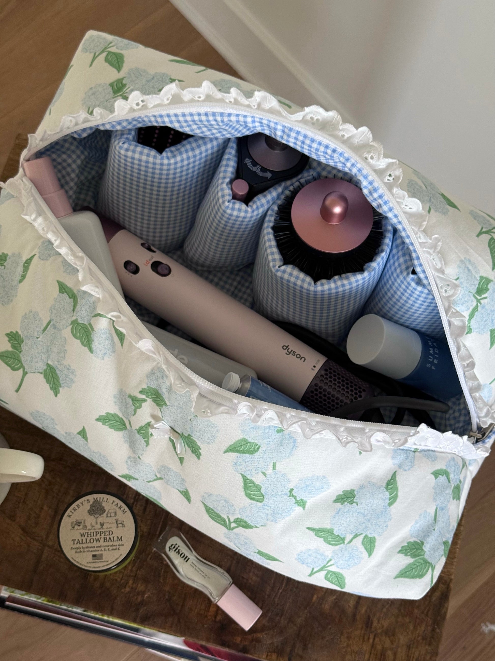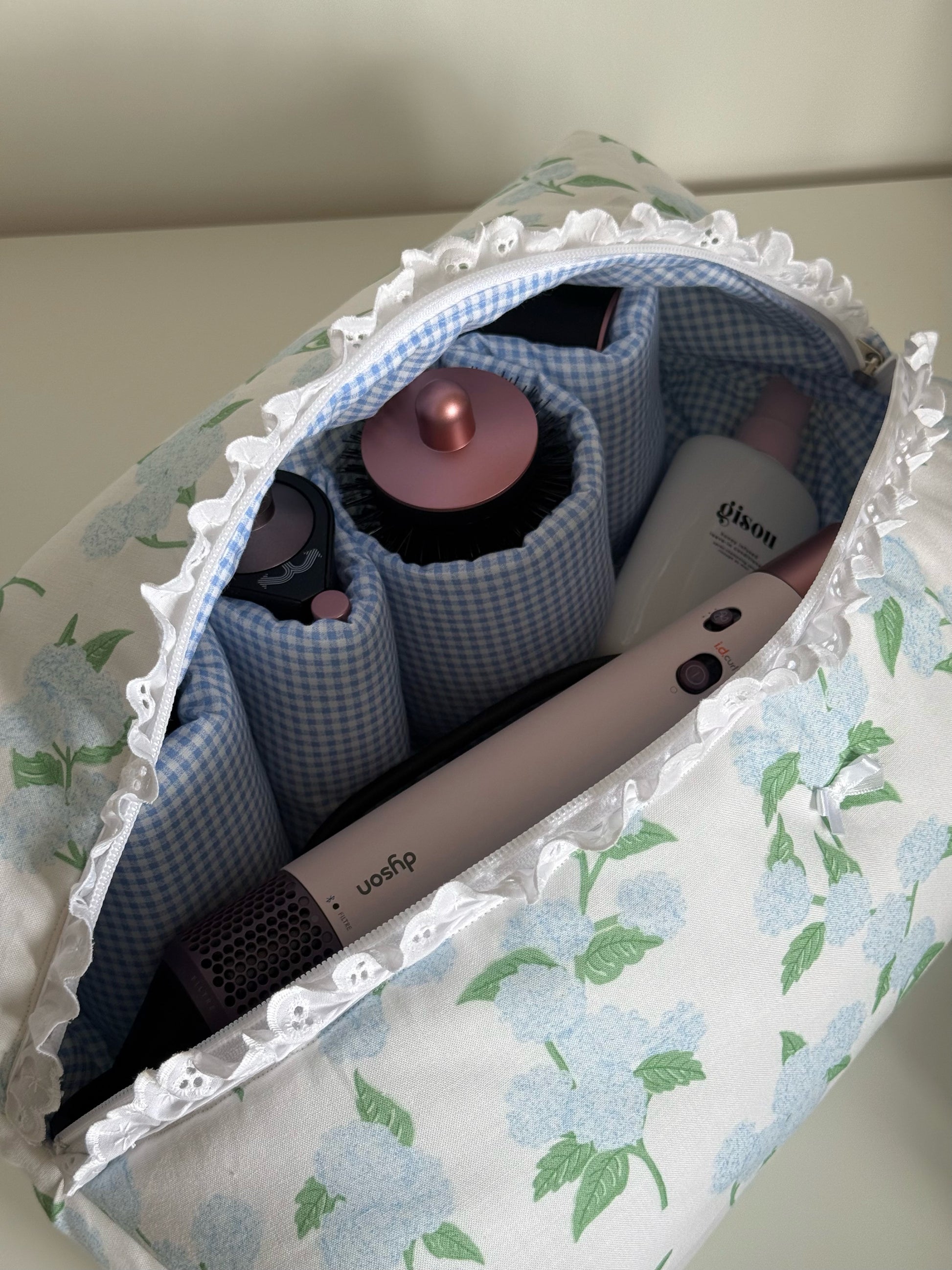 The Hair Tool pouch features 4 right pockets & 1 large pocket, with a gingham inner lining with a broderie detail.