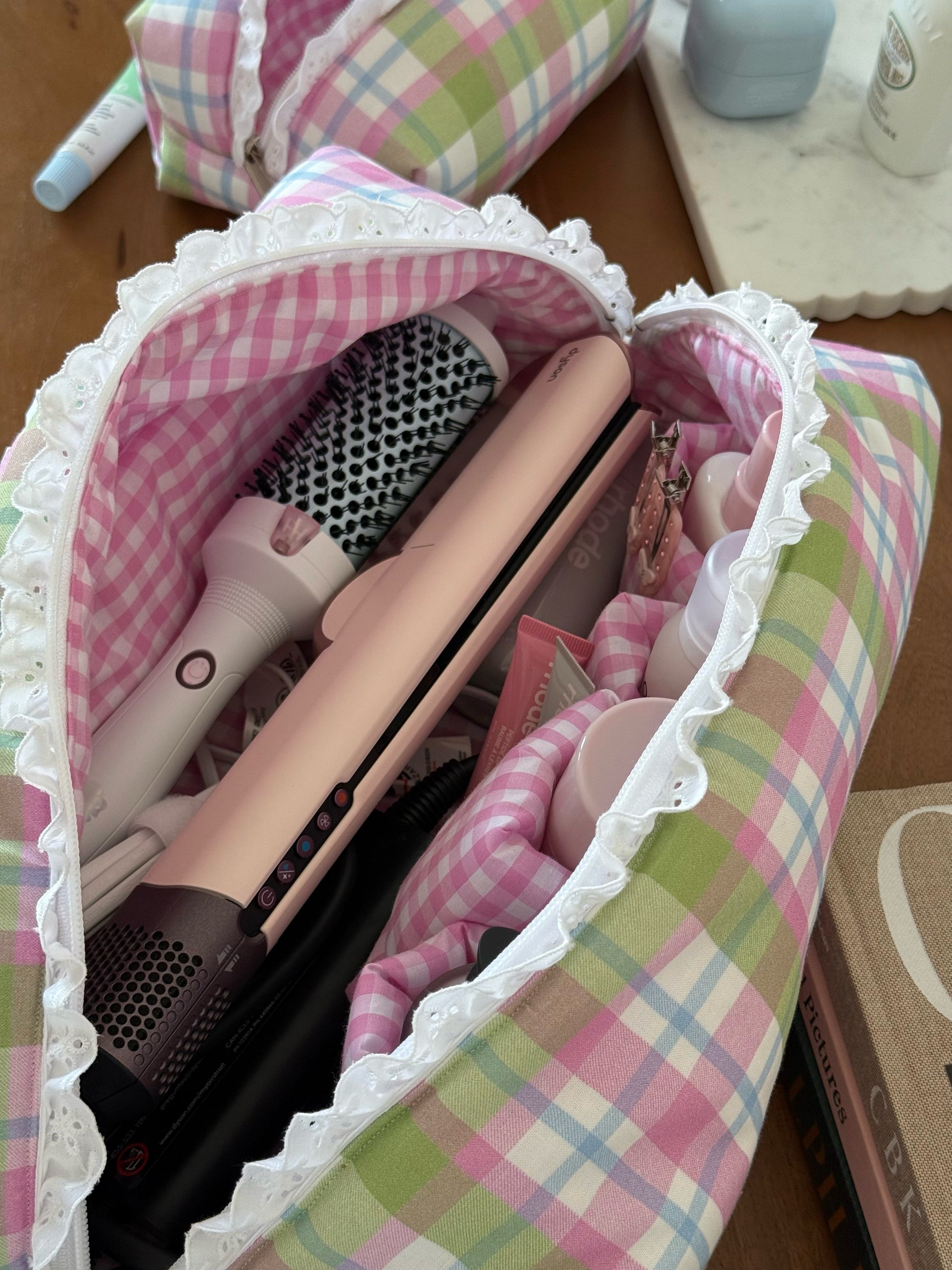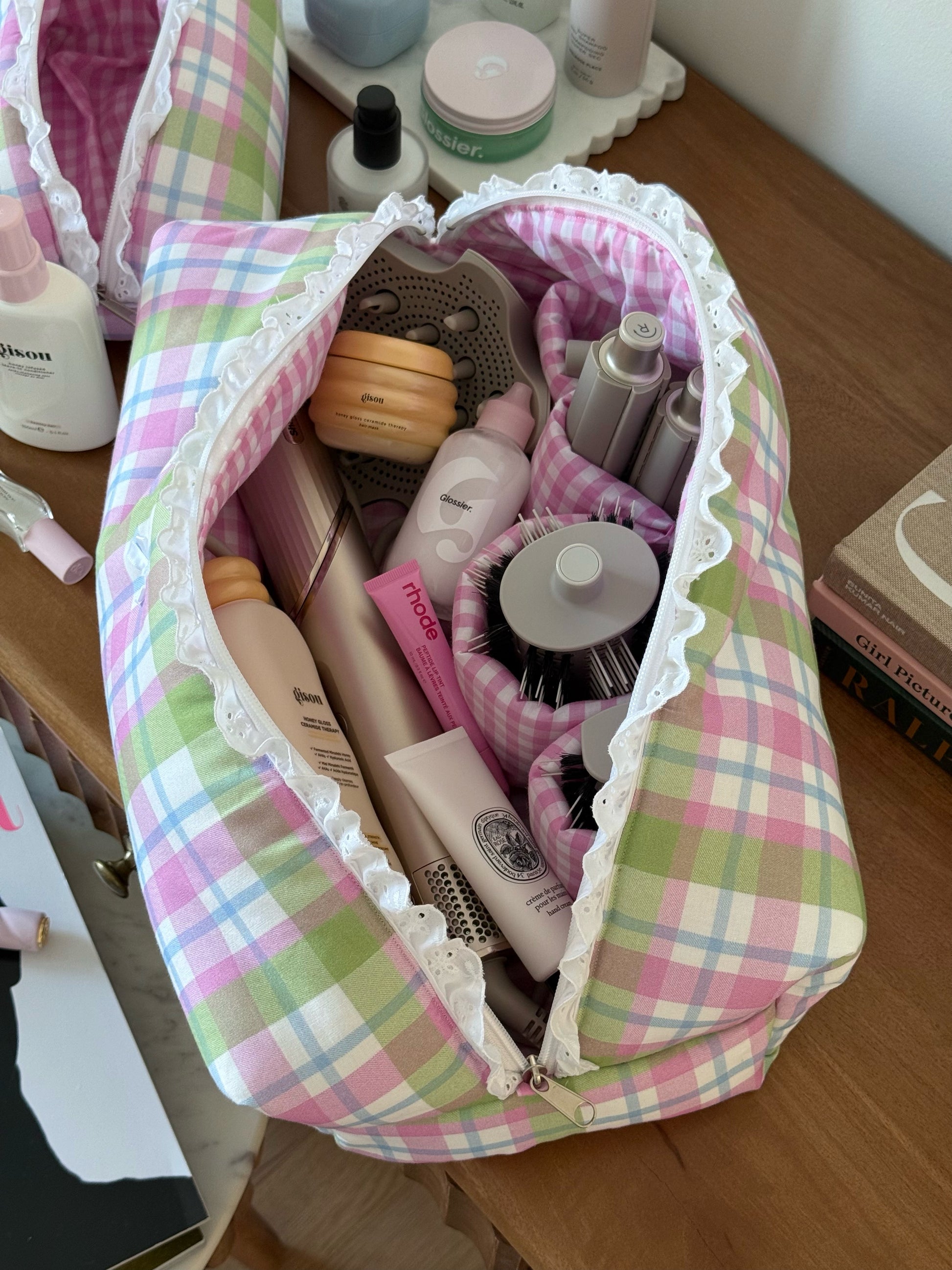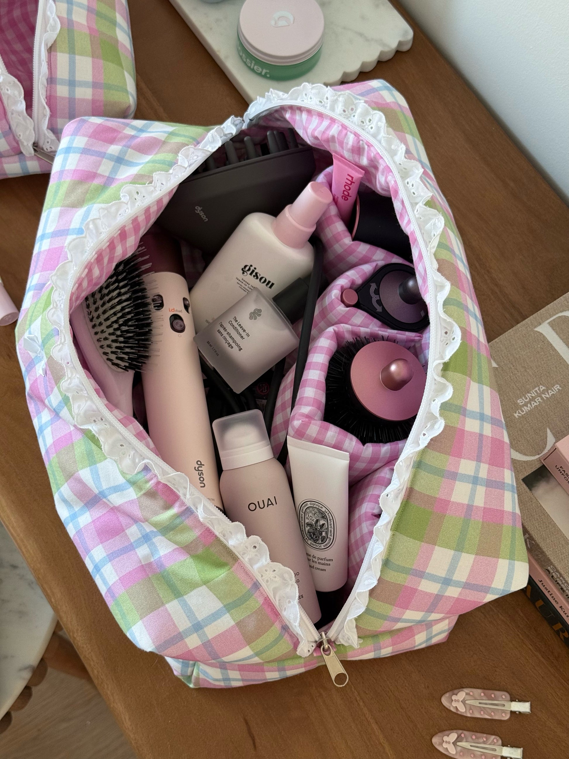 The Hair Tool pouch features 4 right pockets & 1 large pocket, with a gingham inner lining with a broderie detail.
