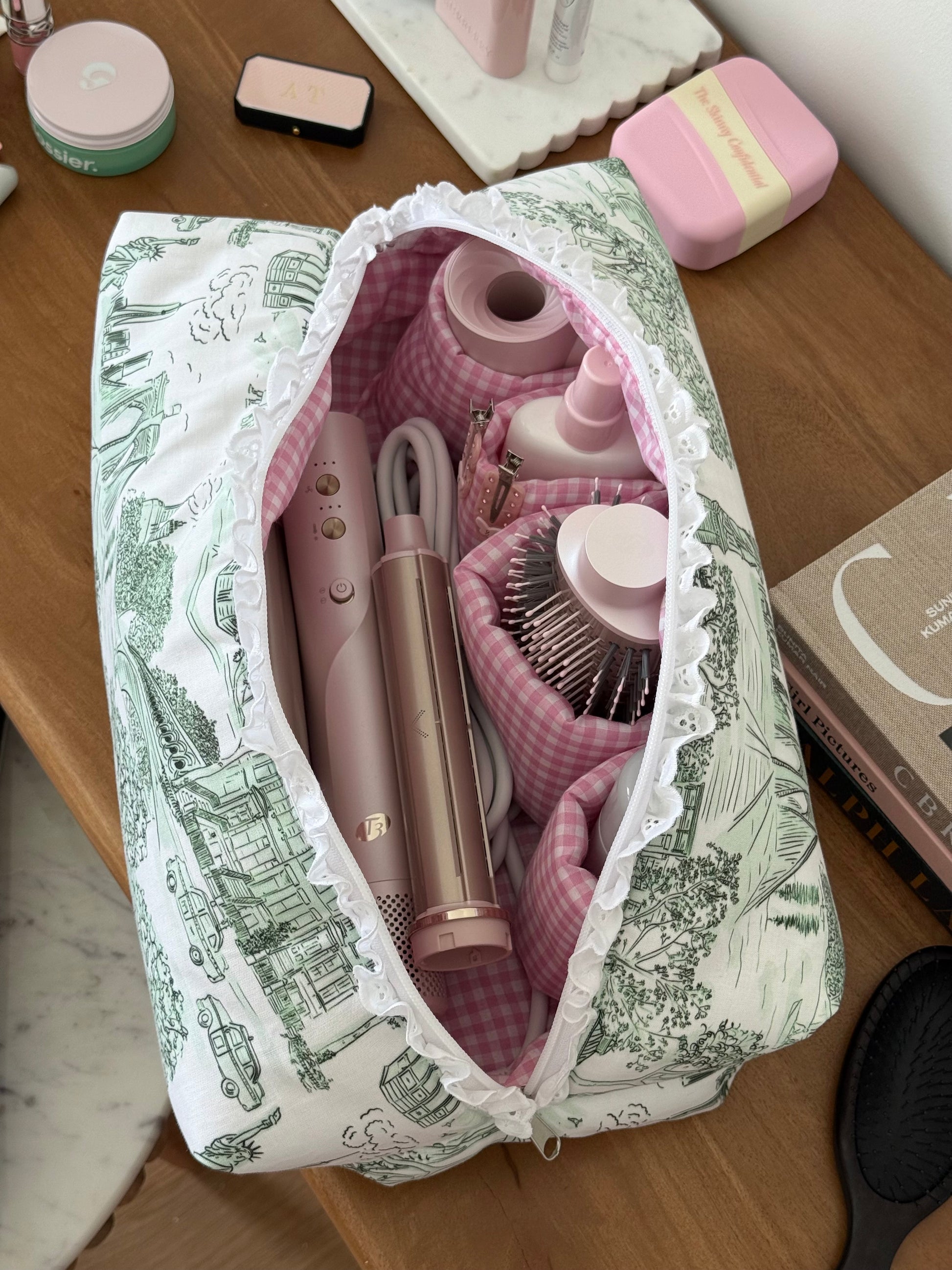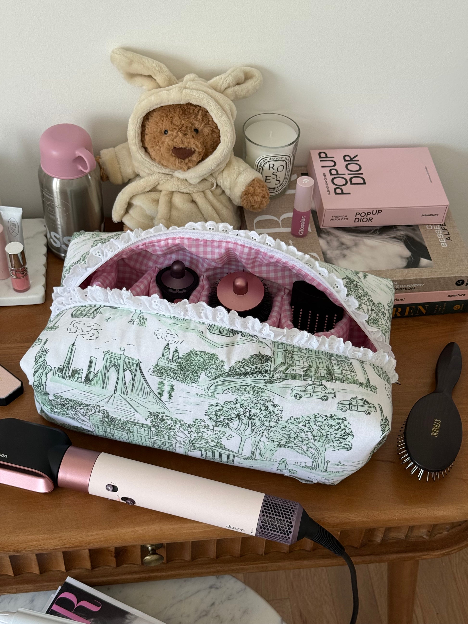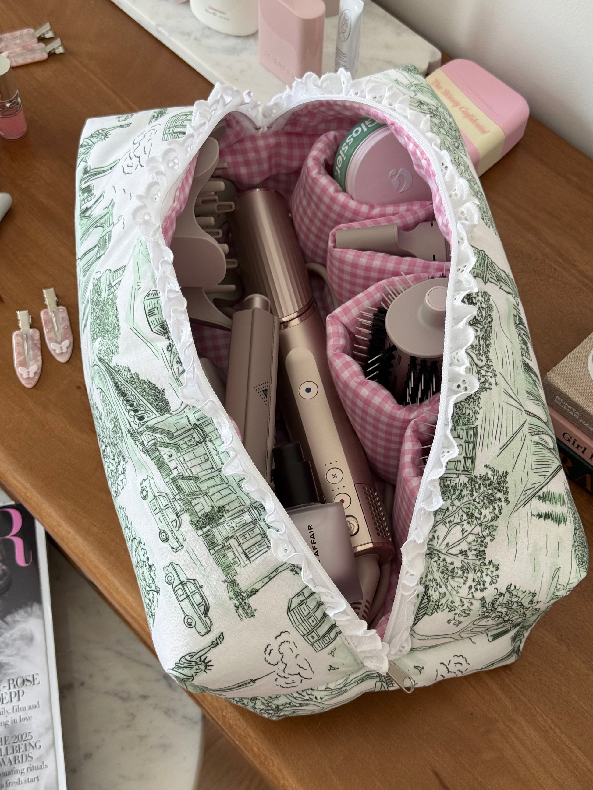The Hair Tool pouch features 4 right pockets & 1 large pocket, with a gingham inner lining with a broderie detail.
