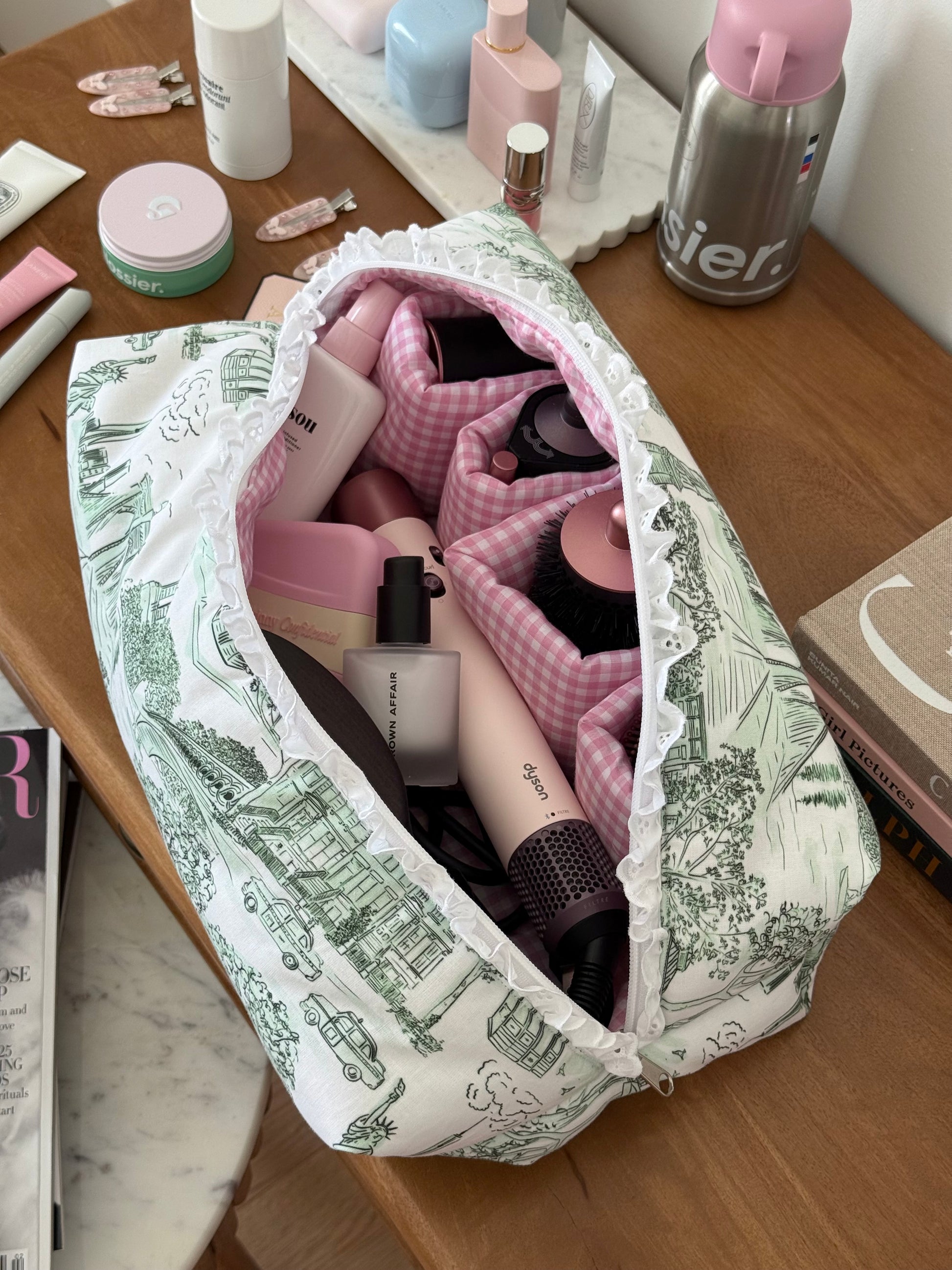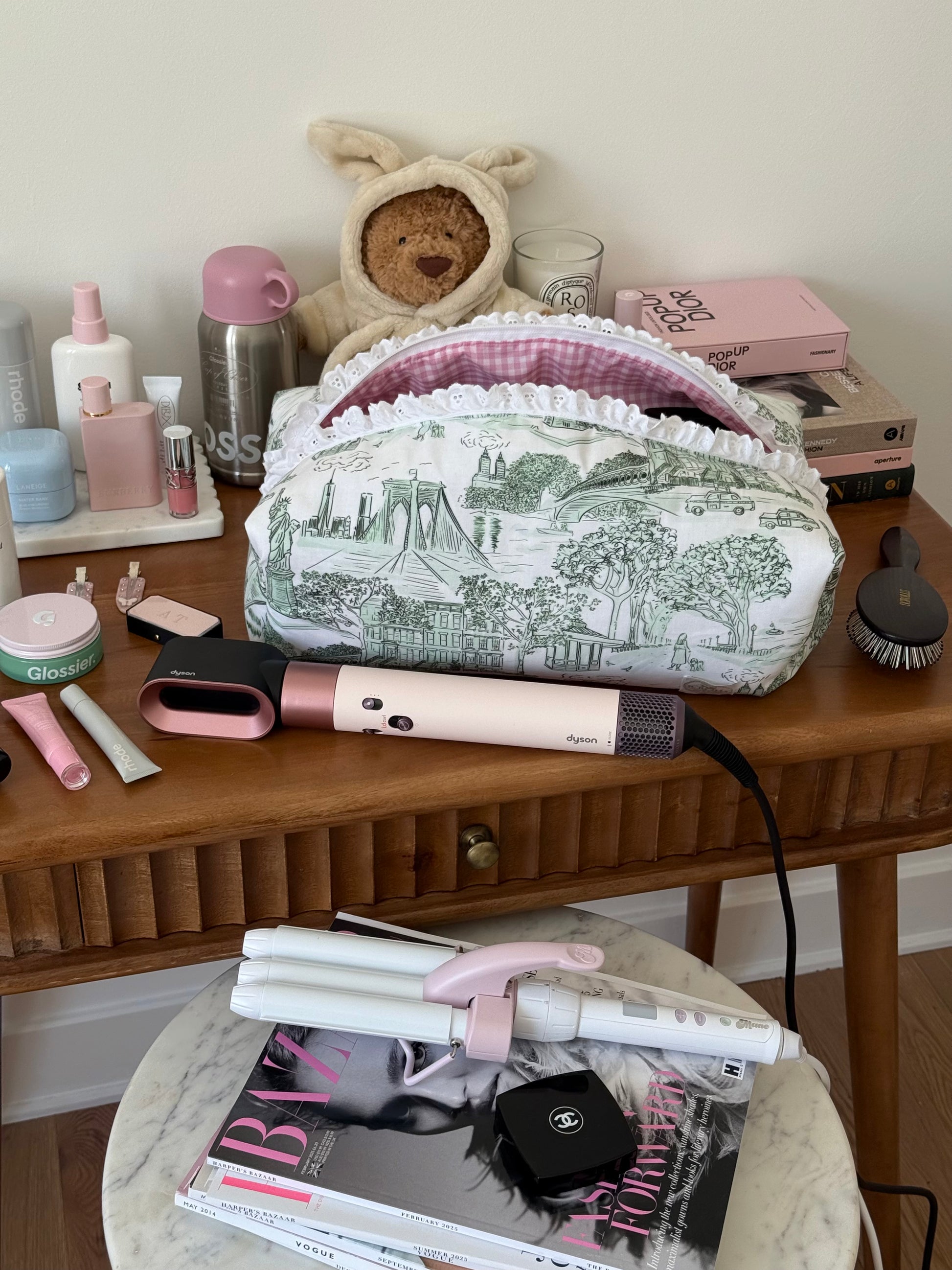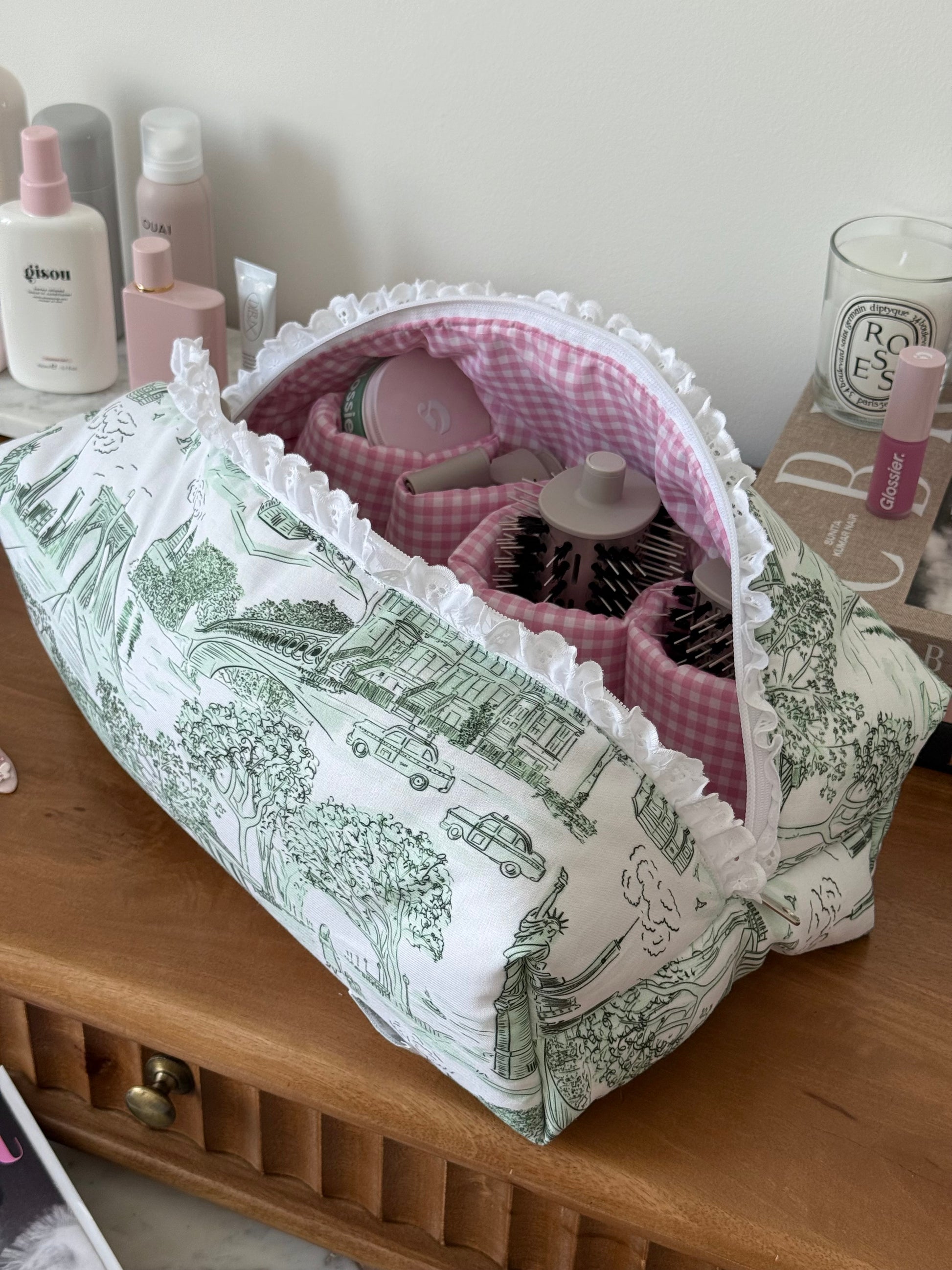 The Hair Tool pouch features 4 right pockets & 1 large pocket, with a gingham inner lining with a broderie detail.