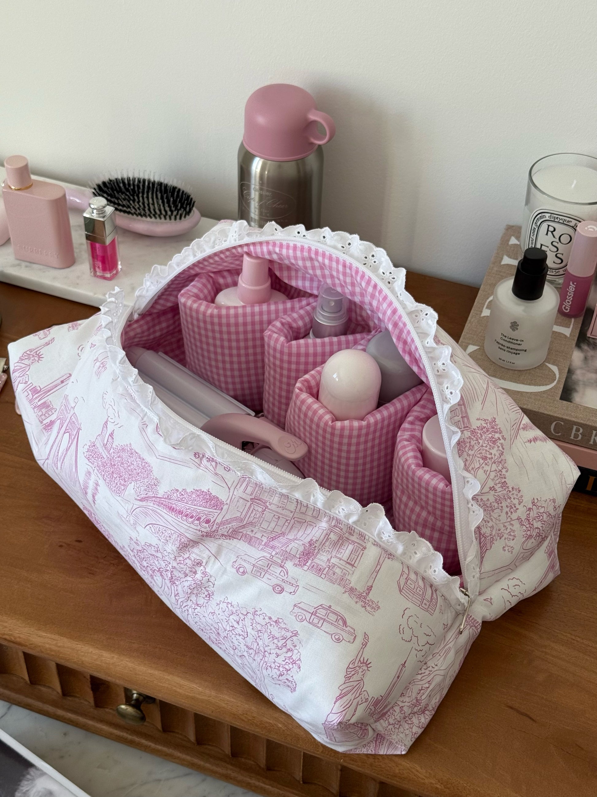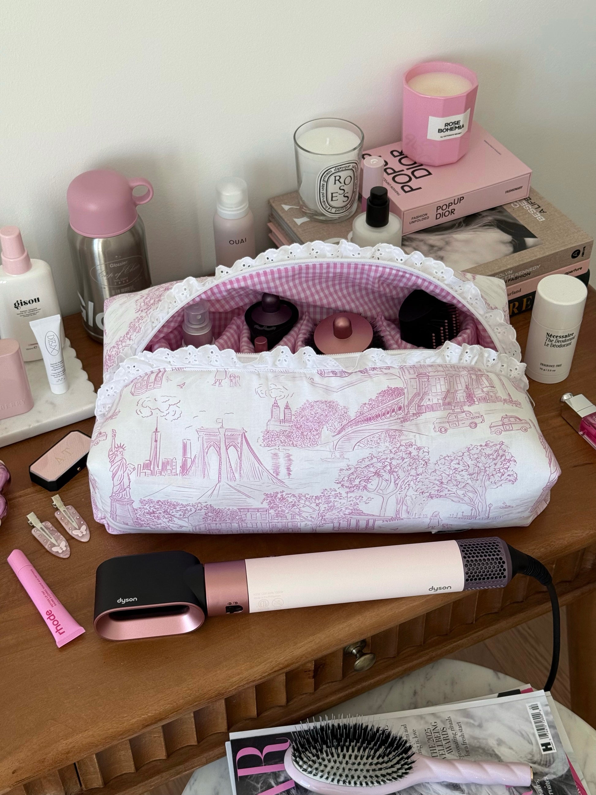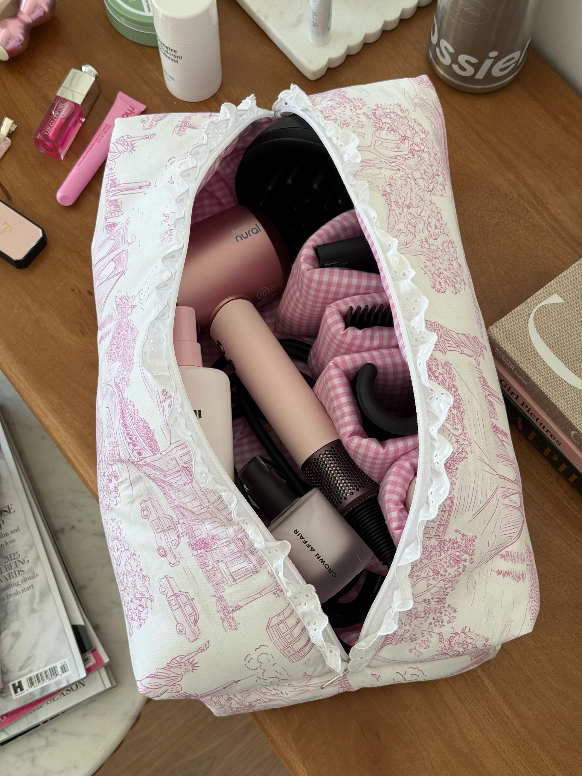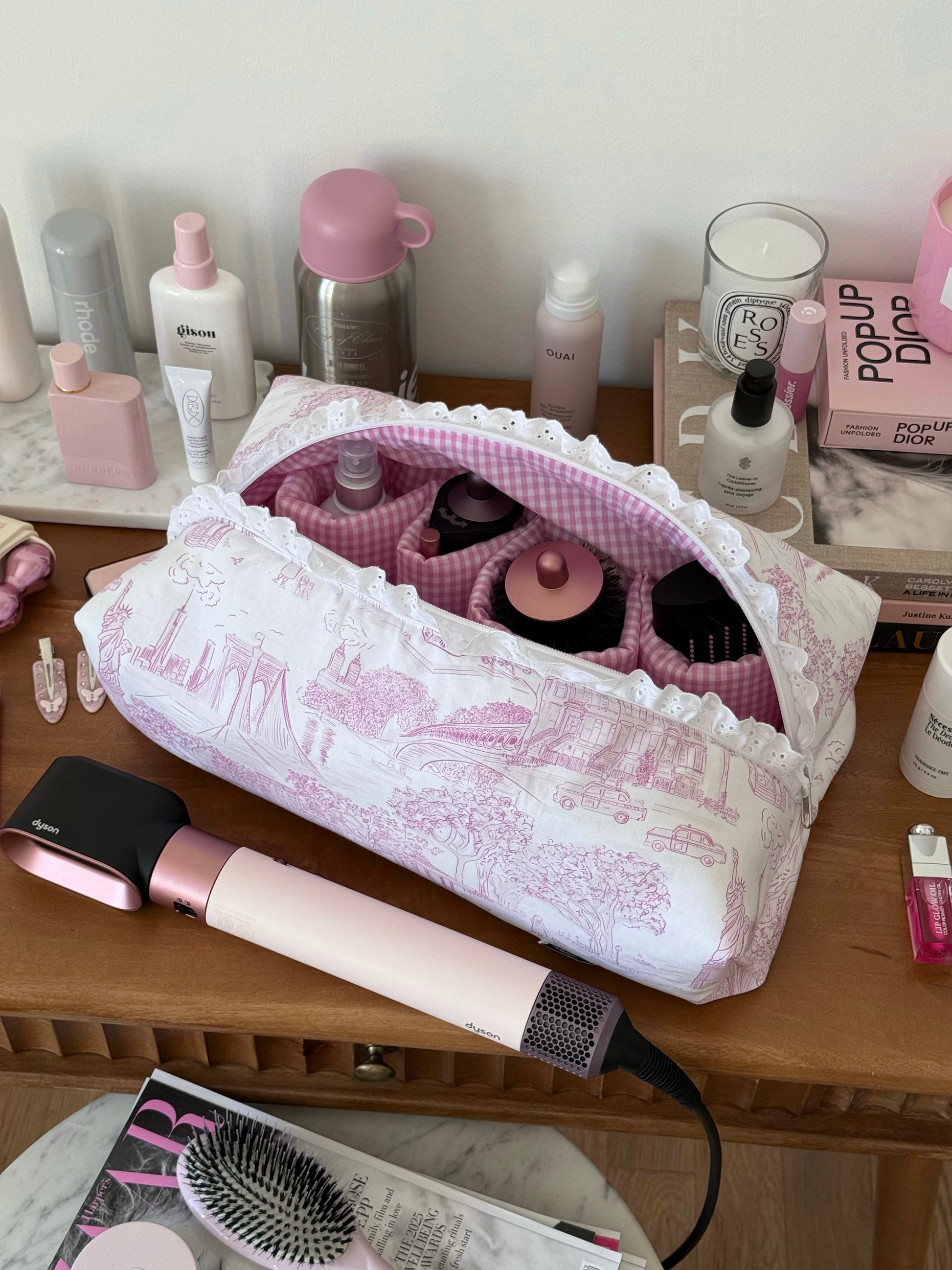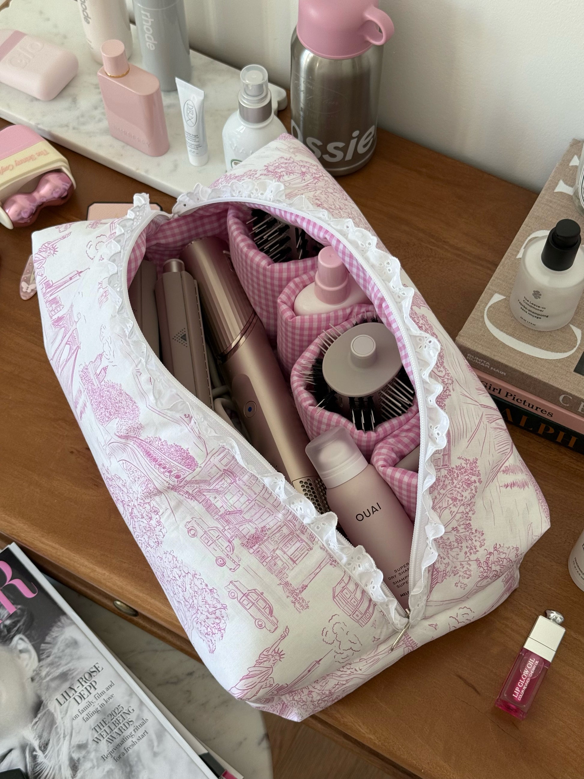 The Hair Tool pouch features 4 right pockets & 1 large pocket, with a gingham inner lining with a broderie detail.