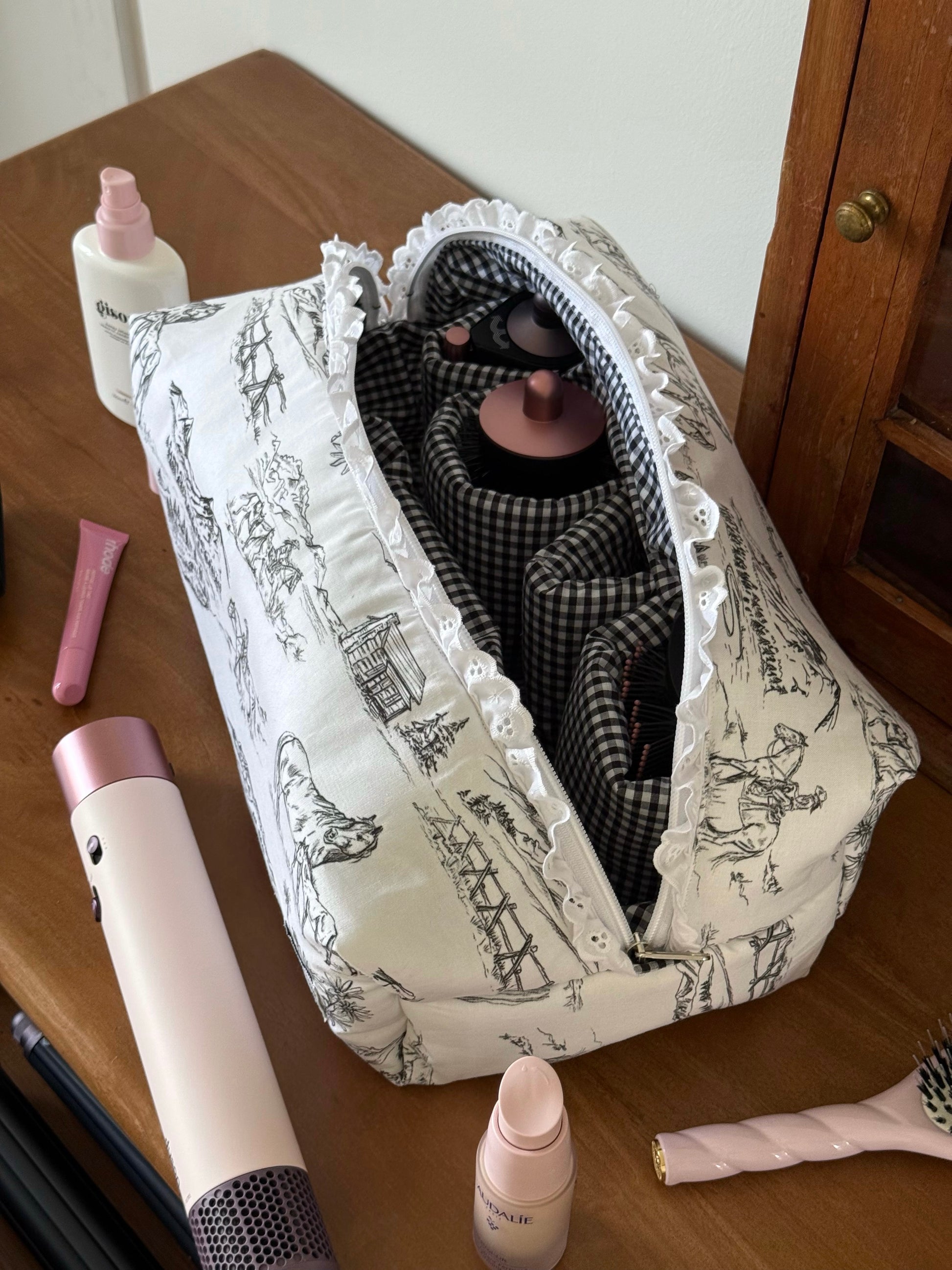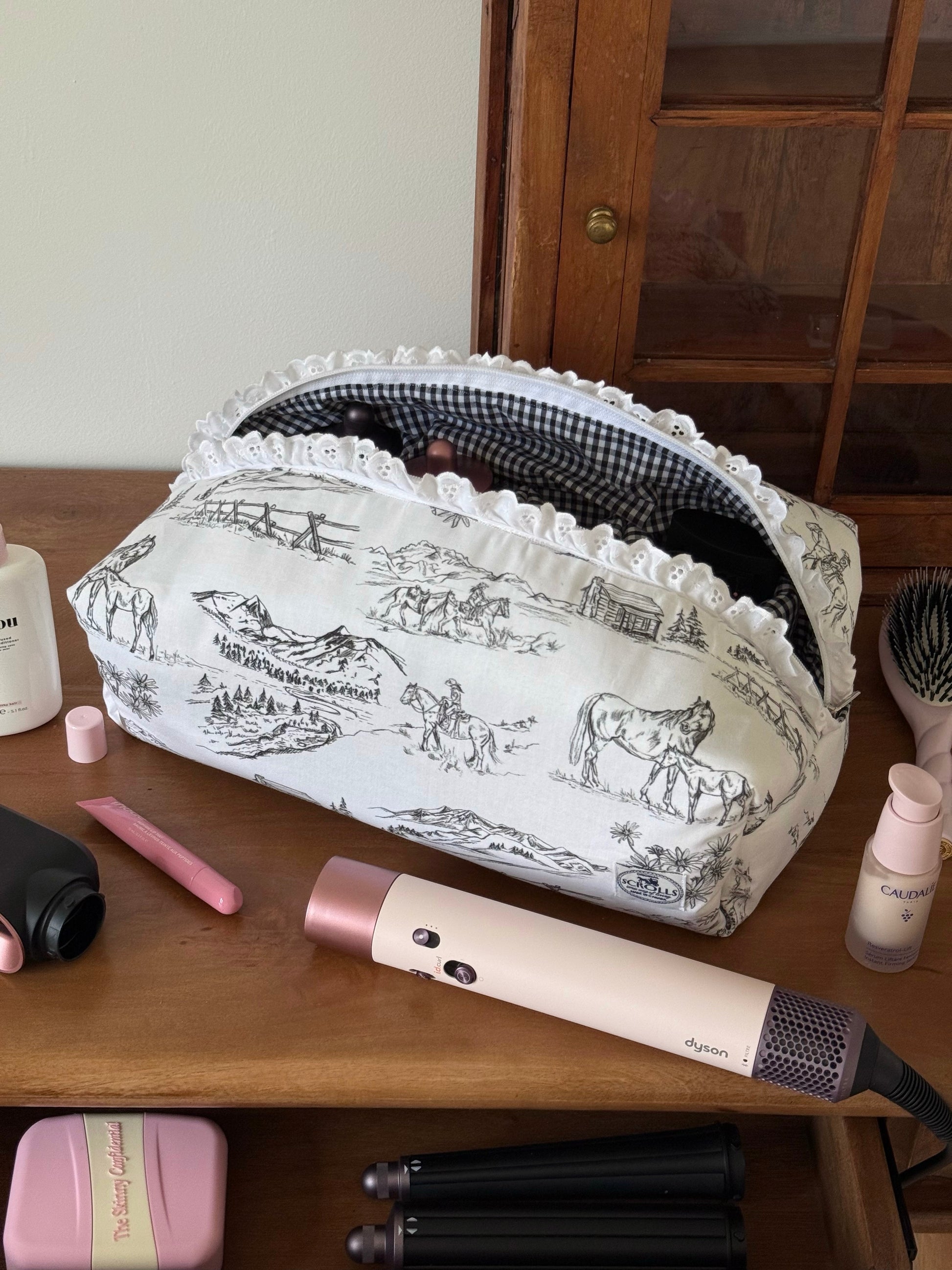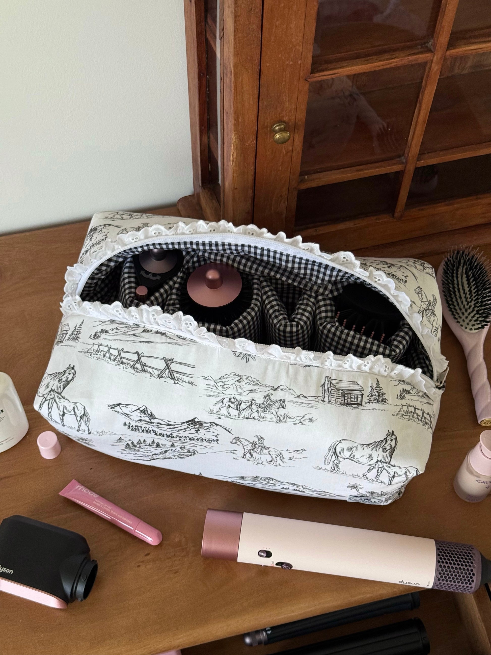 The Hair Tool pouch features 4 right pockets & 1 large pocket, with a gingham inner lining with a broderie detail.