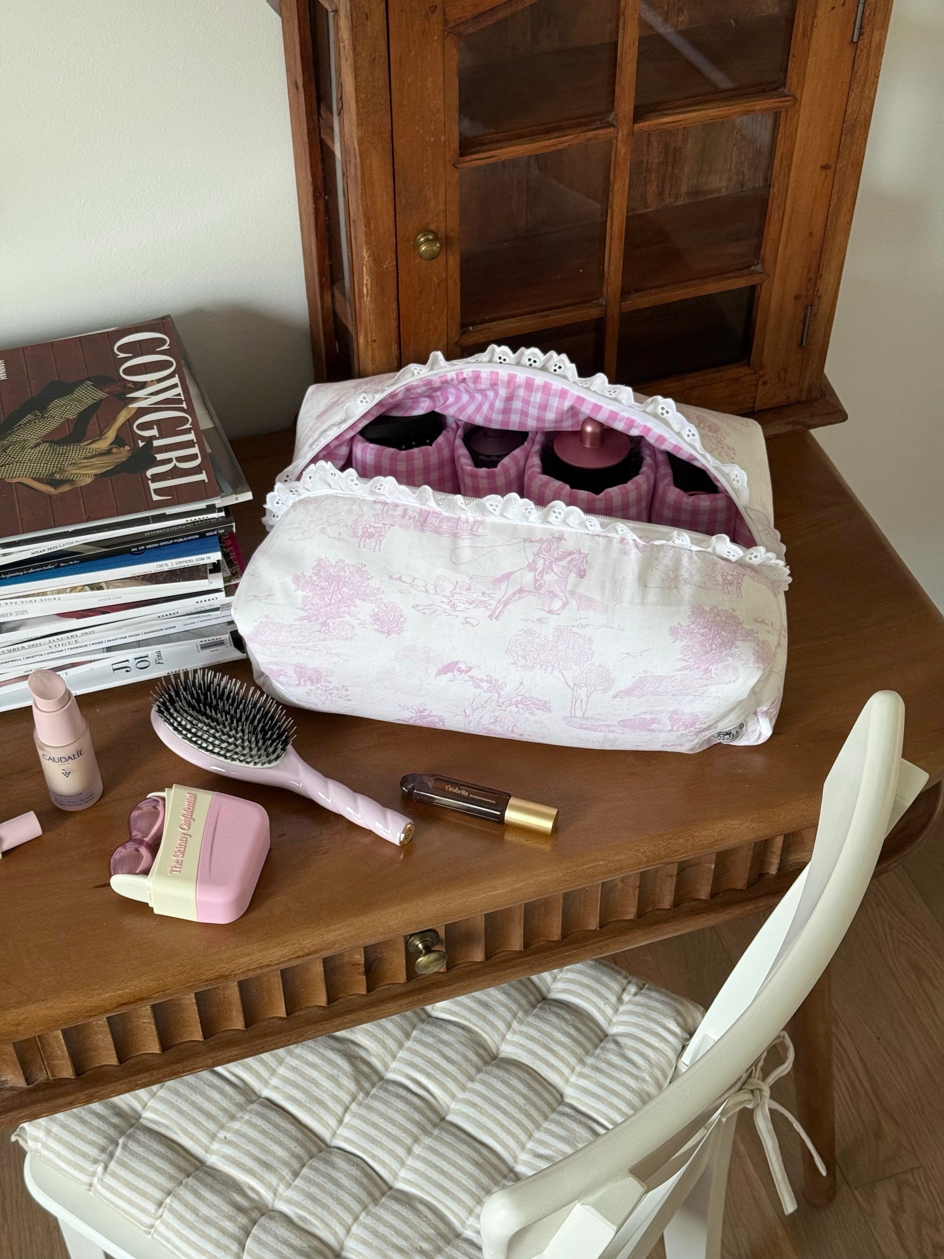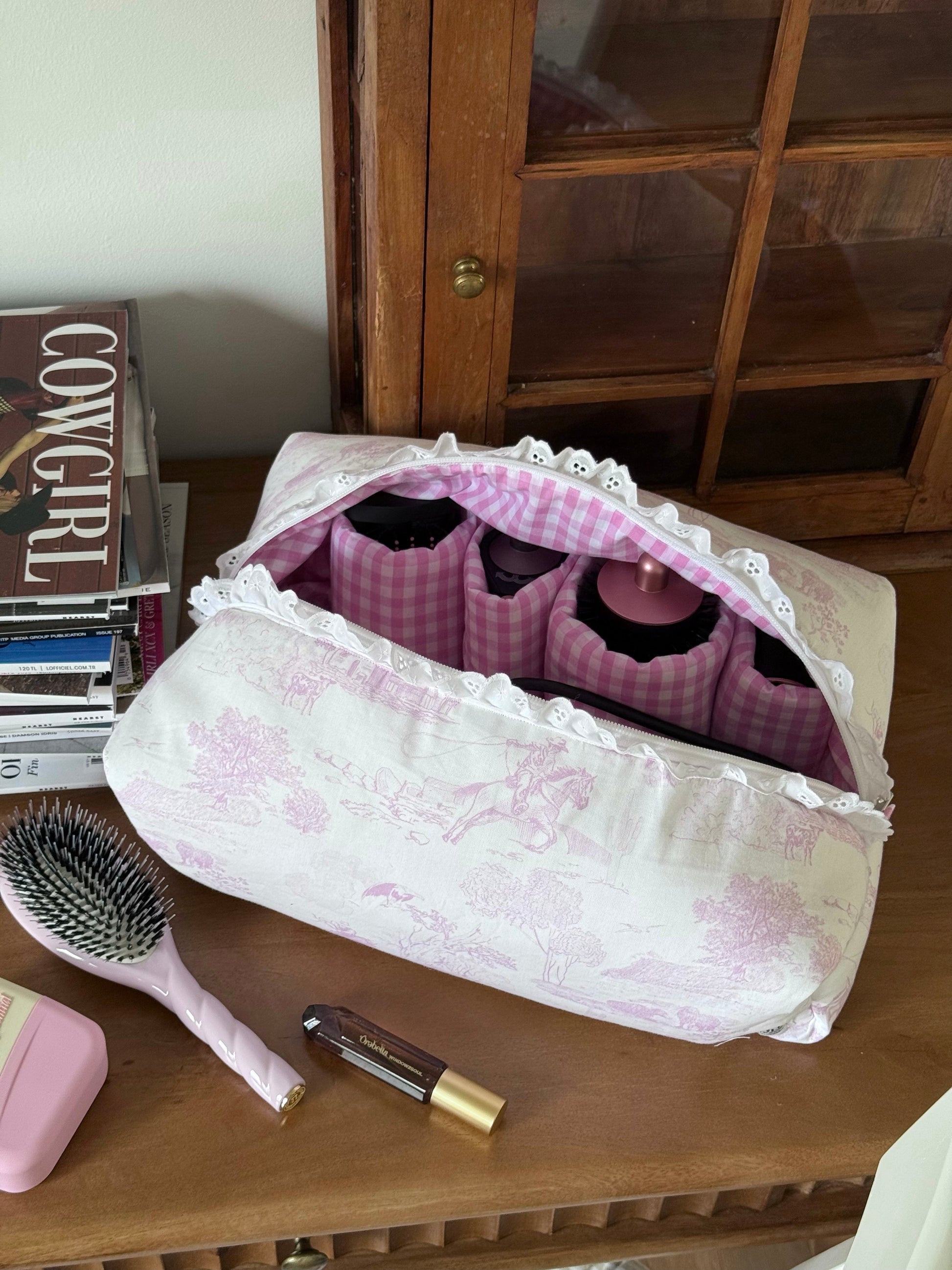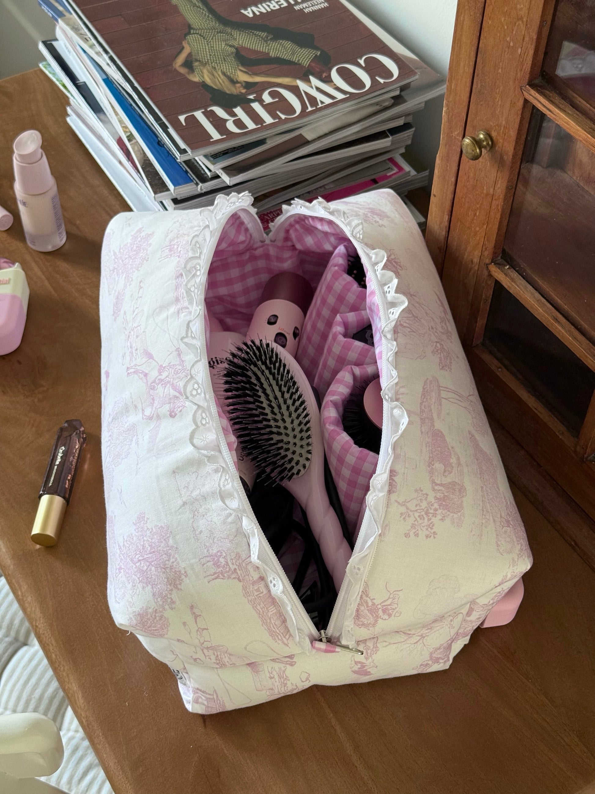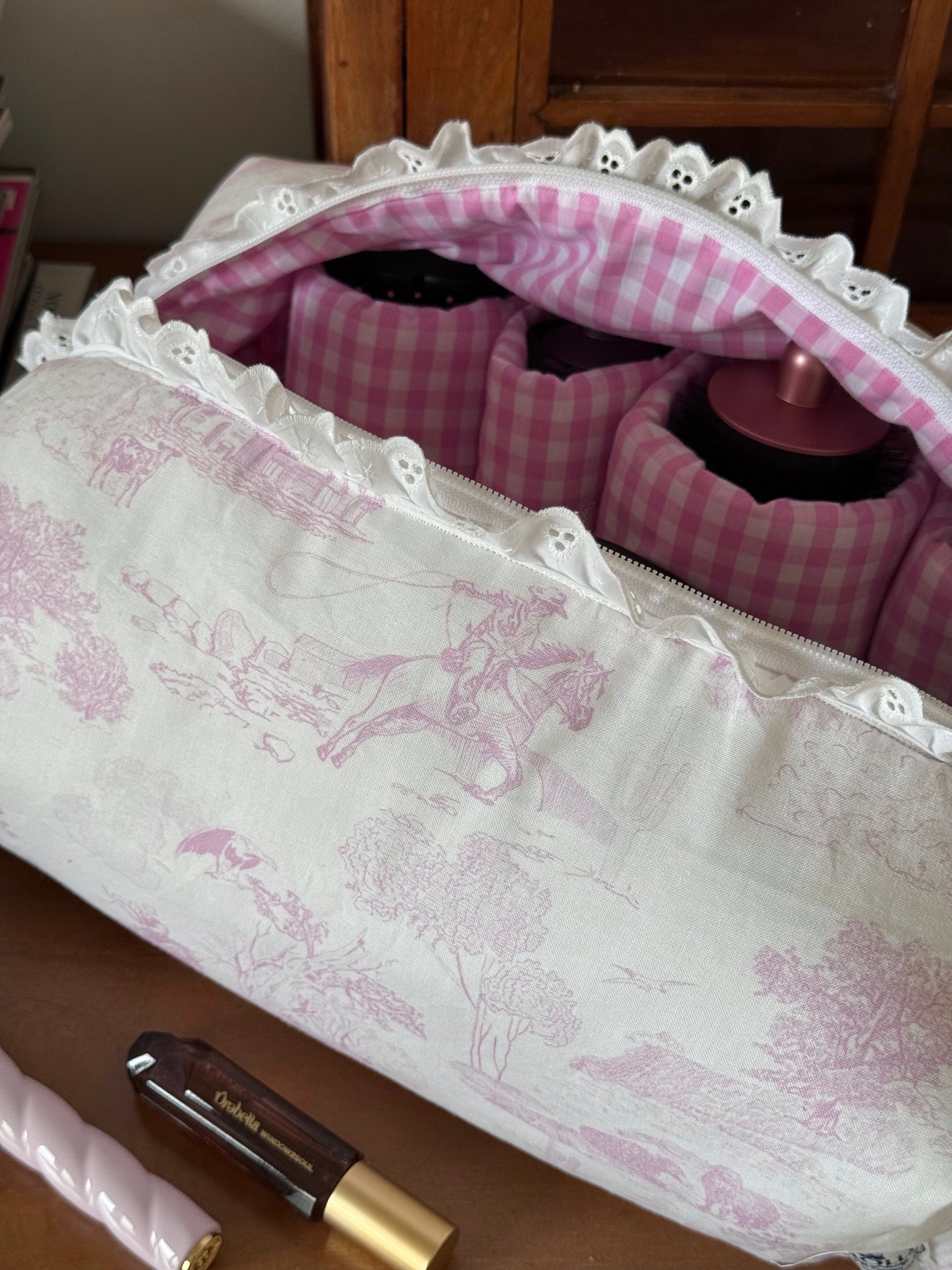 The Hair Tool pouch features 4 right pockets & 1 large pocket, with a gingham inner lining with a broderie detail.