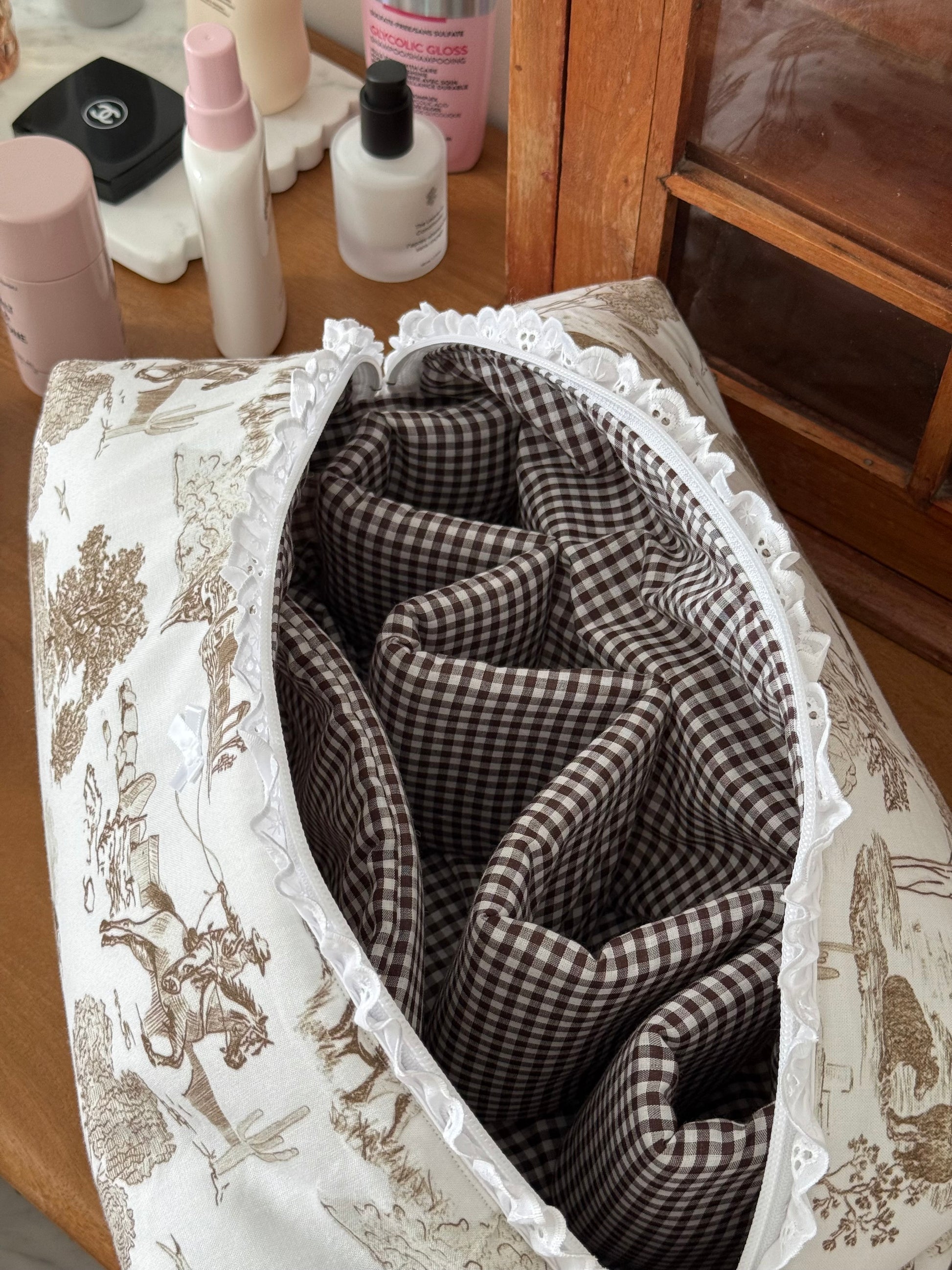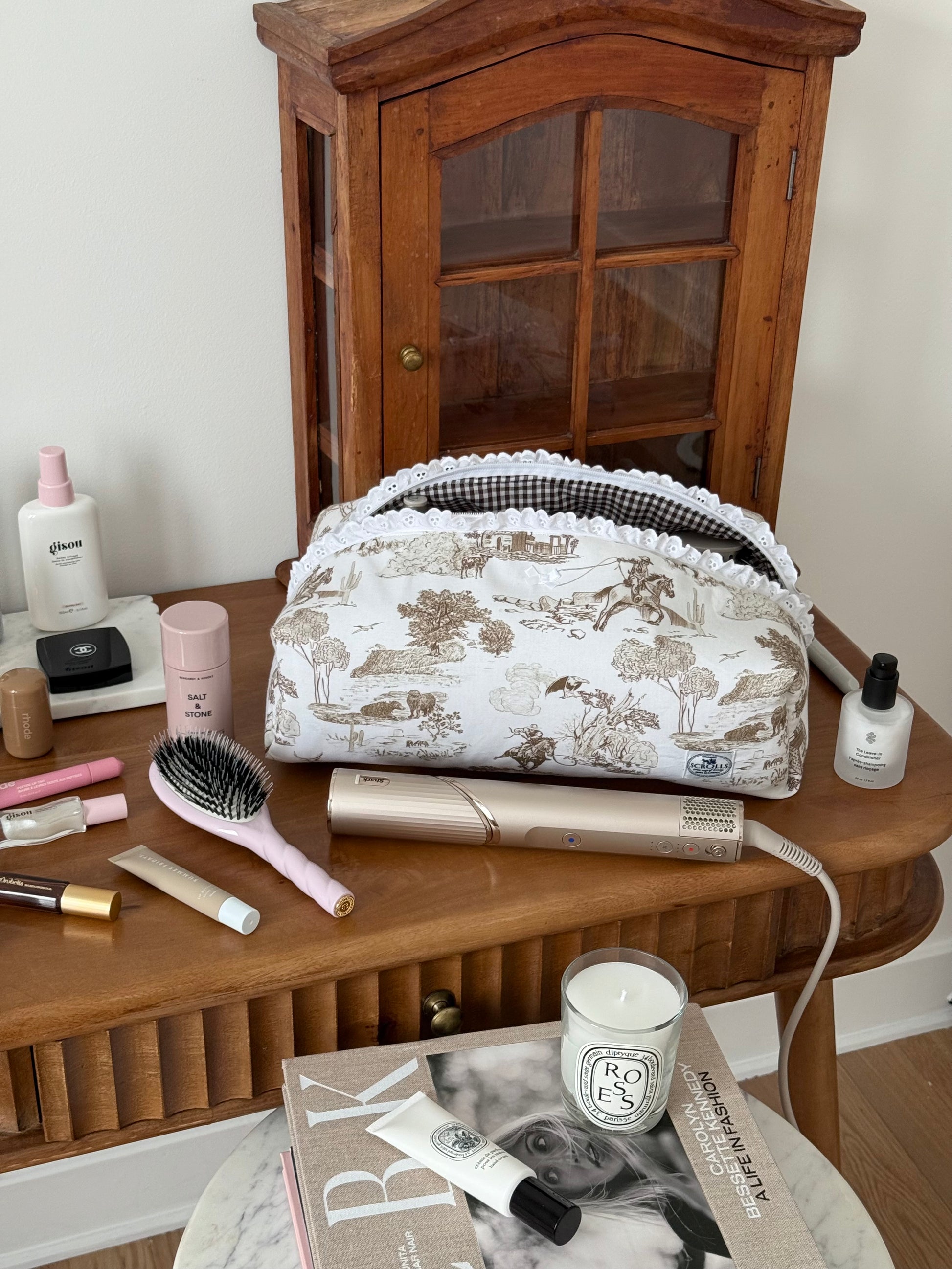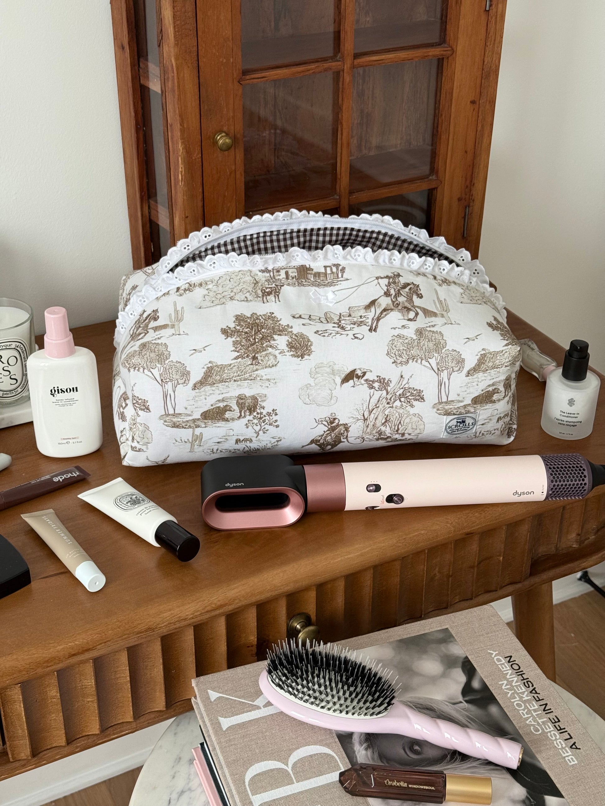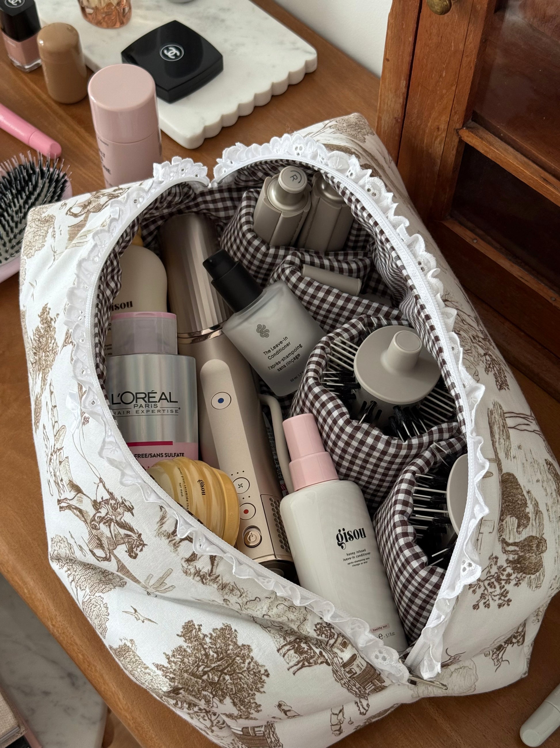 The Hair Tool pouch features 4 right pockets & 1 large pocket, with a gingham inner lining with a broderie detail.
